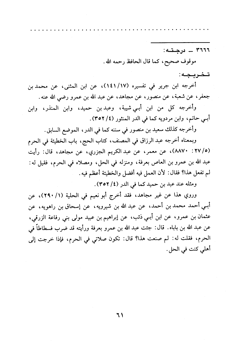 وروي هذا عن غير مجاهد، فقد أخرج أبو نعيم في الحلية (1/ 290)، عن أبي أحمد محمد بن أحمد، عن عبد الله بن شيرويه، عن إسحاق بن راهويه، عن عثمان بن عمرو، عن ابن أبي ذئب، عن إبراهيم بن عبيد مولى بني رفاعة الزرقي، عن عبد الله بن باباه. قال: جئت عبد الله بن عمرو بعرفة ورأيته قد ضرب فسطاطًا في الحرم، فقلت له: لم صنعت هذا؟ قال: تكون صلاتي في الحرم، فإذا خرجت إلى أهلي كنت في الحل.
