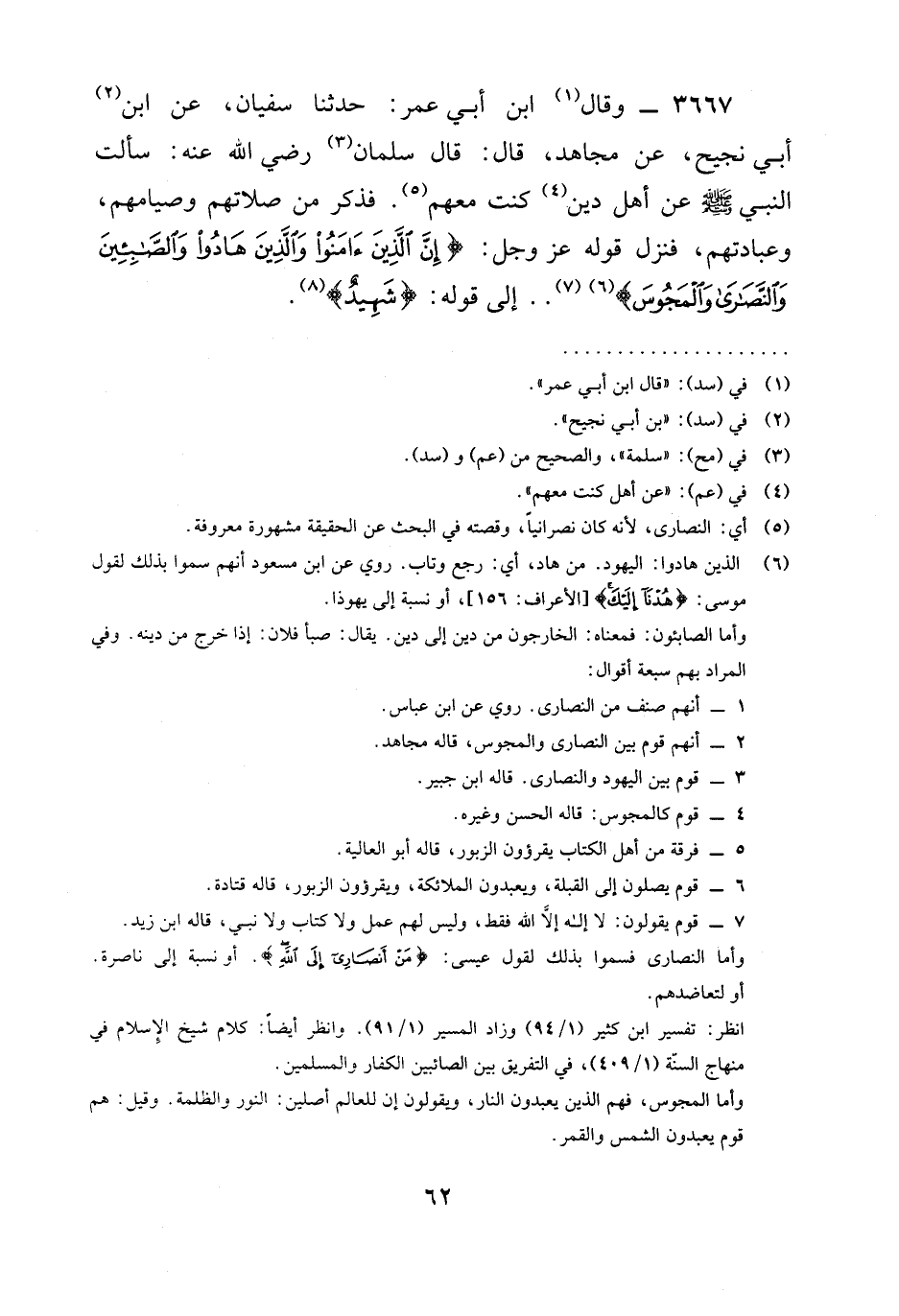 3667 - وَقَالَ ابْنُ أَبِي عُمَرَ: حدثنا سُفْيَانُ، عَنِ ابْنِ أَبِي نَجِيحٍ، عَنْ مُجَاهِدٍ، قَالَ: قَالَ سَلْمَانُ رَضِيَ الله عَنْهُ: سَأَلْتُ النَّبِيَّ صَلَّى اللَّهُ عَلَيْهِ وَسَلَّمَ عَنْ أَهْلِ دِينٍ كُنْتُ مَعَهُمْ. فَذَكَرَ مِنْ صَلَاتِهِمْ وَصِيَامِهِمْ، وَعِبَادَتِهِمْ، §فَنَزَلَ قَوْلُهُ عَزَّ وَجَلَّ: {إِنَّ الَّذِينَءَامَنْوا وَالَّذِينَ هَادُوا وَالصَّابِئِينَ وَالنَّصَارَى وَالْمَجُوسَ} . . إلى قَوْلِهِ: {شَهِيدٌ} .