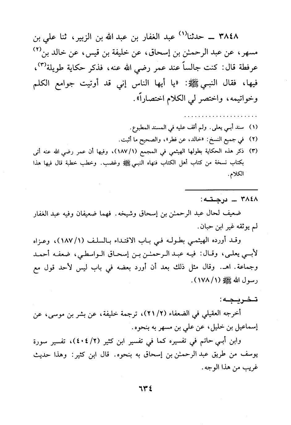 3848 - حدثنا عَبْدُ الْغَفَّارِ بْنُ عَبْدِ اللَّهِ بْنِ الزُّبَيْرِ، ثنا عَلِيُّ بْنُ مُسْهِرٍ، عَنْ عَبْدِ الرَّحْمَنِ بْنِ إِسْحَاقَ، عَنْ خَلِيفَةَ بْنِ قَيْسٍ، عَنْ خَالِدِ بْنِ عُرْفُطَةَ قَالَ: كُنْتُ جَالِسًا عِنْدَ عُمَرَ رَضِيَ الله عَنْه، فَذَكَرَ حِكَايَةً طَوِيلَةً، فِيهَا، فَقَالَ النَّبِيُّ صَلَّى اللَّهُ عَلَيْهِ وَسَلَّمَ: " يَا أَيُّهَا النَّاسُ إِنِّي قَدْ §أُوتِيتُ جَوَامِعَ الْكَلِمِ وخواتيمه، وَاخْتُصِرَ لِي الْكَلَامُ اخْتِصَارًا ".