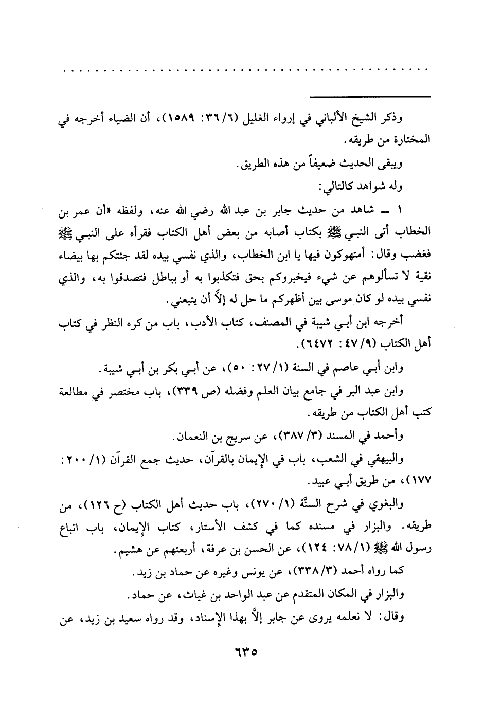 1 - شاهد من حديث جابر بن عبد الله رضي الله عنه، ولفظه "أن عمر بن الخطاب أتى النبي -صلى الله عليه وسلم- بكتاب أصابه من بعض أهل الكتاب فقرأه على النبي -صلى الله عليه وسلم- فغضب وقال: أمتهوكون فيها يا ابن الخطاب، والذي نفسي بيده لقد جئتكم بها بيضاء نقية لا تسألوهم عن شيء فيخبروكم بحق فتكذبوا به أو بباطل فتصدقوا به، والذي نفسي بيده لو كان موسى بين أظهركم ما حل له إلَّا أن يتبعني.