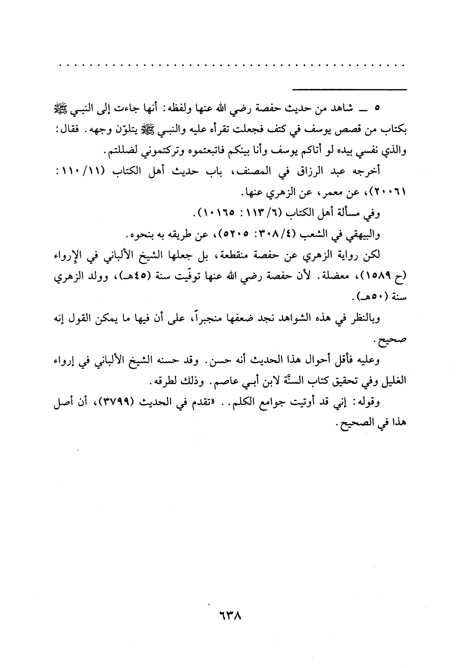 = 5 - شاهد من حديث حفصة رضي الله عنها ولفظه: أنها جاءت إلى النبي -صلى الله عليه وسلم- بكتاب من قصص يوسف في كتف فجعلت تقرأه عليه وَالنَّبِيُّ -صَلَّى اللَّهُ عَلَيْهِ وَسَلَّمَ- يَتَلَوَّنُ وَجْهُهُ. فقال: والذي نفسي بيده لو أتاكم يوسف وأنا بينكم فاتبعتموه وتركتموني لضللتم.