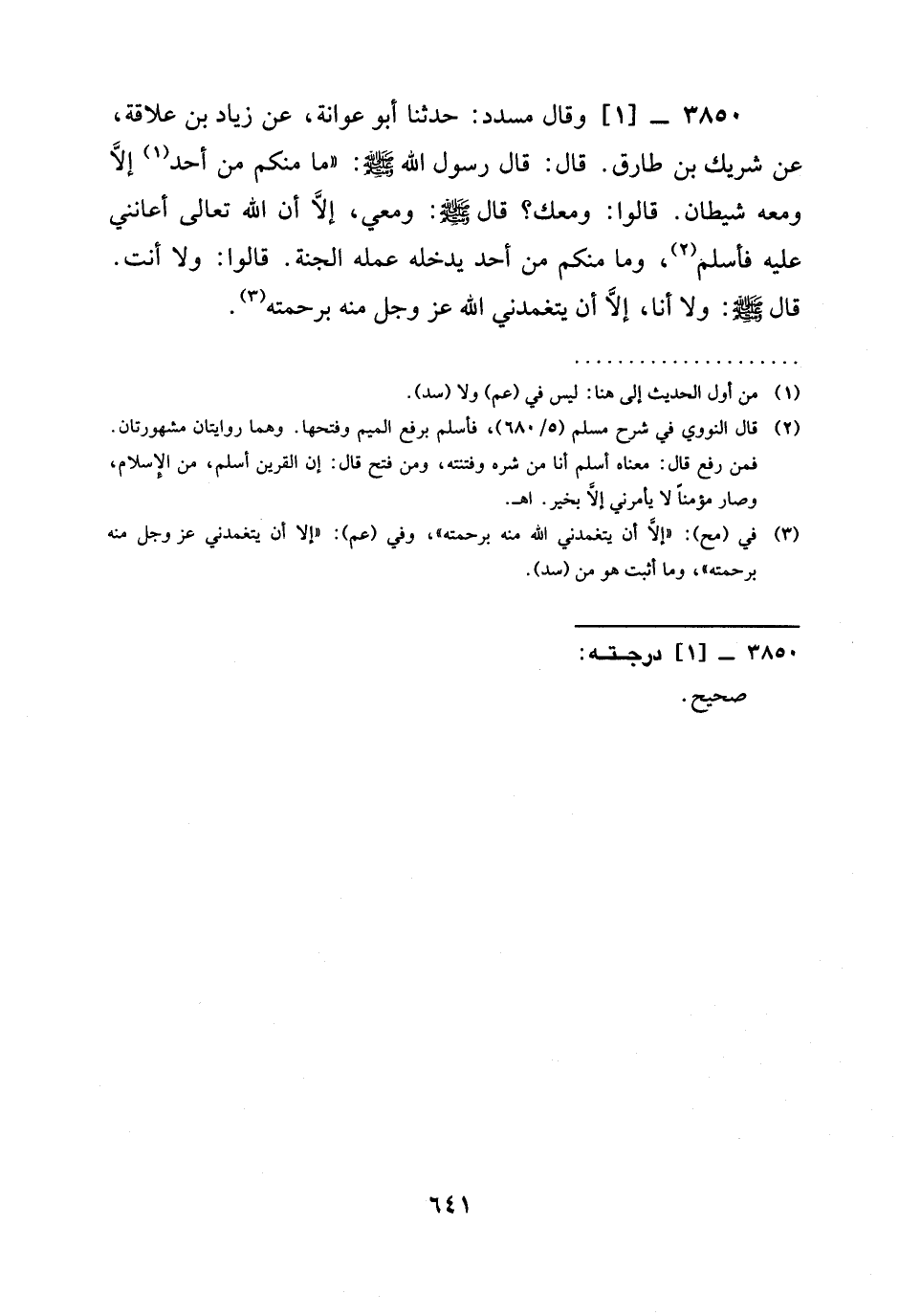 3850 -[1] وَقَالَ مُسَدَّدٌ: حدثنا أَبُو عَوَانَةَ، عَنْ زِيَادِ بْنِ عِلَاقَةَ، عَنْ شَرِيكِ بْنِ طَارِقٍ. قَالَ: قَالَ رَسُولُ اللَّهِ صَلَّى اللَّهُ عَلَيْهِ وَسَلَّمَ: " §مَا مِنْكُمْ مِنْ أَحَدٍ إِلَّا وَمَعَهُ شَيْطَانٌ. قَالُوا: وَمَعَكَ؟ قَالَ صَلَّى اللَّهُ عَلَيْهِ وَسَلَّمَ: وَمَعِي، إِلَّا أن الله تعالى أَعَانَنِي عَلَيْهِ فَأَسْلَمَ، وَمَا مِنْكُمْ مِنْ أَحَدٍ يُدْخِلُهُ عَمَلُهُ الْجَنَّةَ. قَالُوا: وَلَا أَنْتَ. قَالَ صَلَّى اللَّهُ عَلَيْهِ وَسَلَّمَ: وَلَا أَنَا، إِلَّا أَنْ يتغمدني الله عز وجل مِنْهُ برحمته -[642]-.