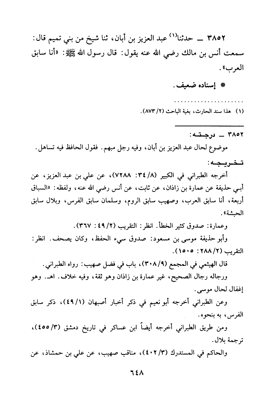 3852 - حدثنا عَبْدُ الْعَزِيزِ بْنُ أَبَانَ، ثنا شَيْخٌ مِنْ بَنِي تَمِيمٍ قَالَ: سَمِعْتُ أَنَسَ بْنَ مَالِكٍ رَضِيَ الله عَنْه يَقُولُ: قَالَ رَسُولُ اللَّهِ صَلَّى اللَّهُ عَلَيْهِ وَسَلَّمَ: " §أَنَا سَابِقُ الْعَرَبِ ".