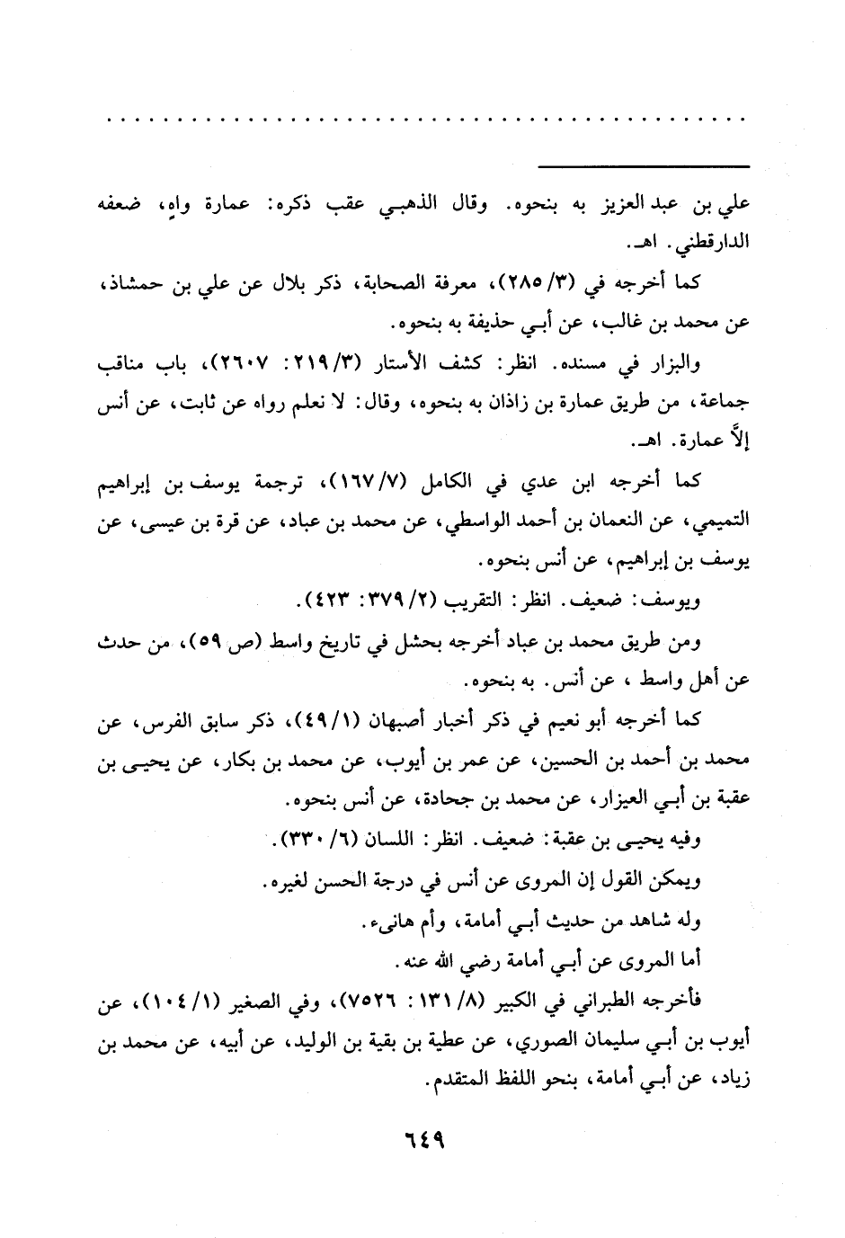 = علي بن عبد العزيز به بنحوه. وقال الذهبي عقب ذكره: عمارة واهٍ، ضعفه الدراقطني. اهـ.