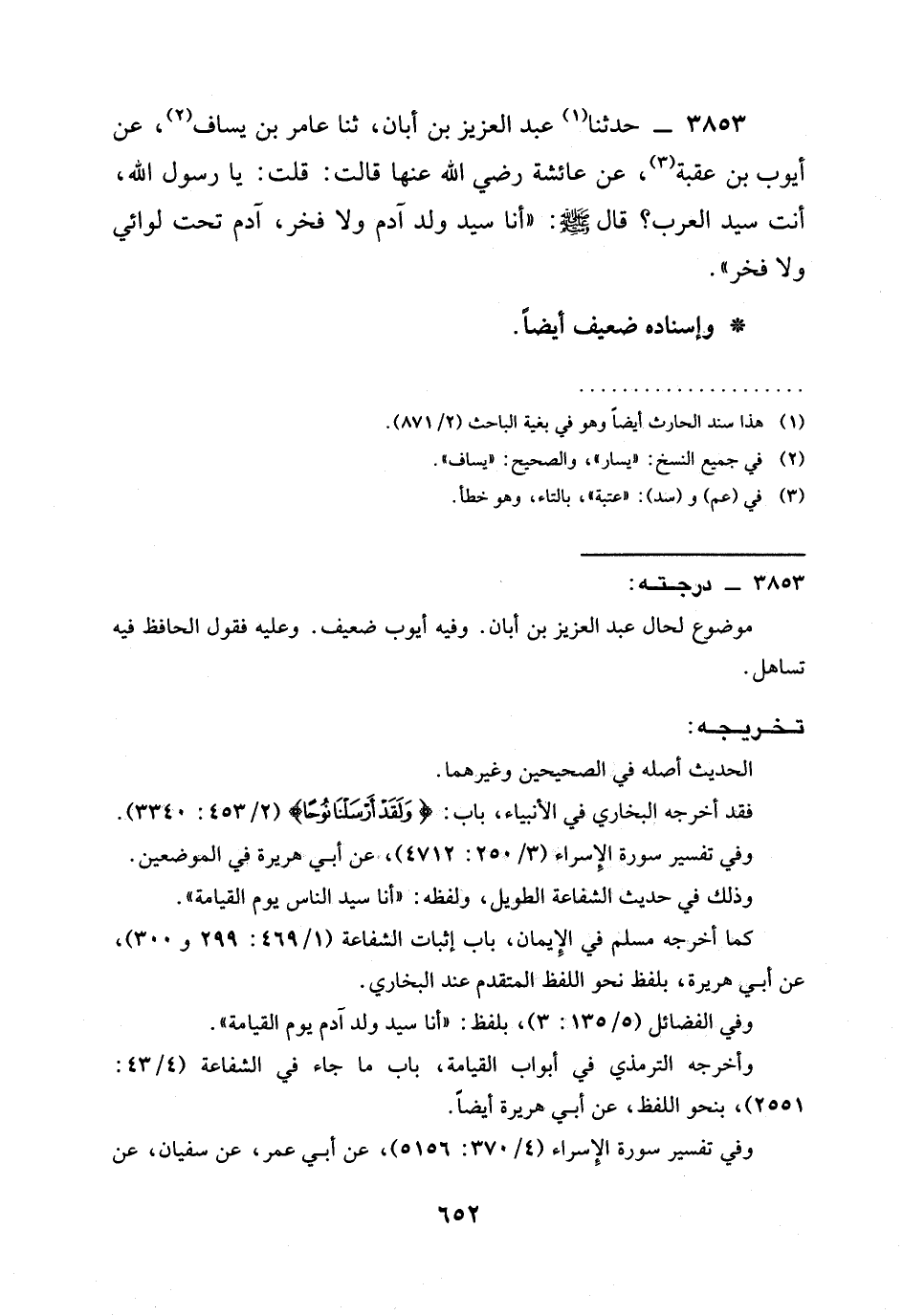 3853 - حدثنا عَبْدُ الْعَزِيزِ بْنُ أَبَانَ، ثنا عَامِرُ بْنُ يَسَافٍ، عَنْ أيوب بن عقبة، عن عائشة رَضِيَ الله عَنْها قَالَتْ: قُلْتُ: يَا رَسُولَ اللَّهِ، أَنْتَ سَيِّدُ الْعَرَبِ؟ قَالَ صَلَّى اللَّهُ عَلَيْهِ وَسَلَّمَ: " §أَنَا سَيِّدُ وَلَدِ آدَمَ وَلَا فَخْرَ، آدَمُ تَحْتَ لِوَائِي وَلَا فَخْرَ ".