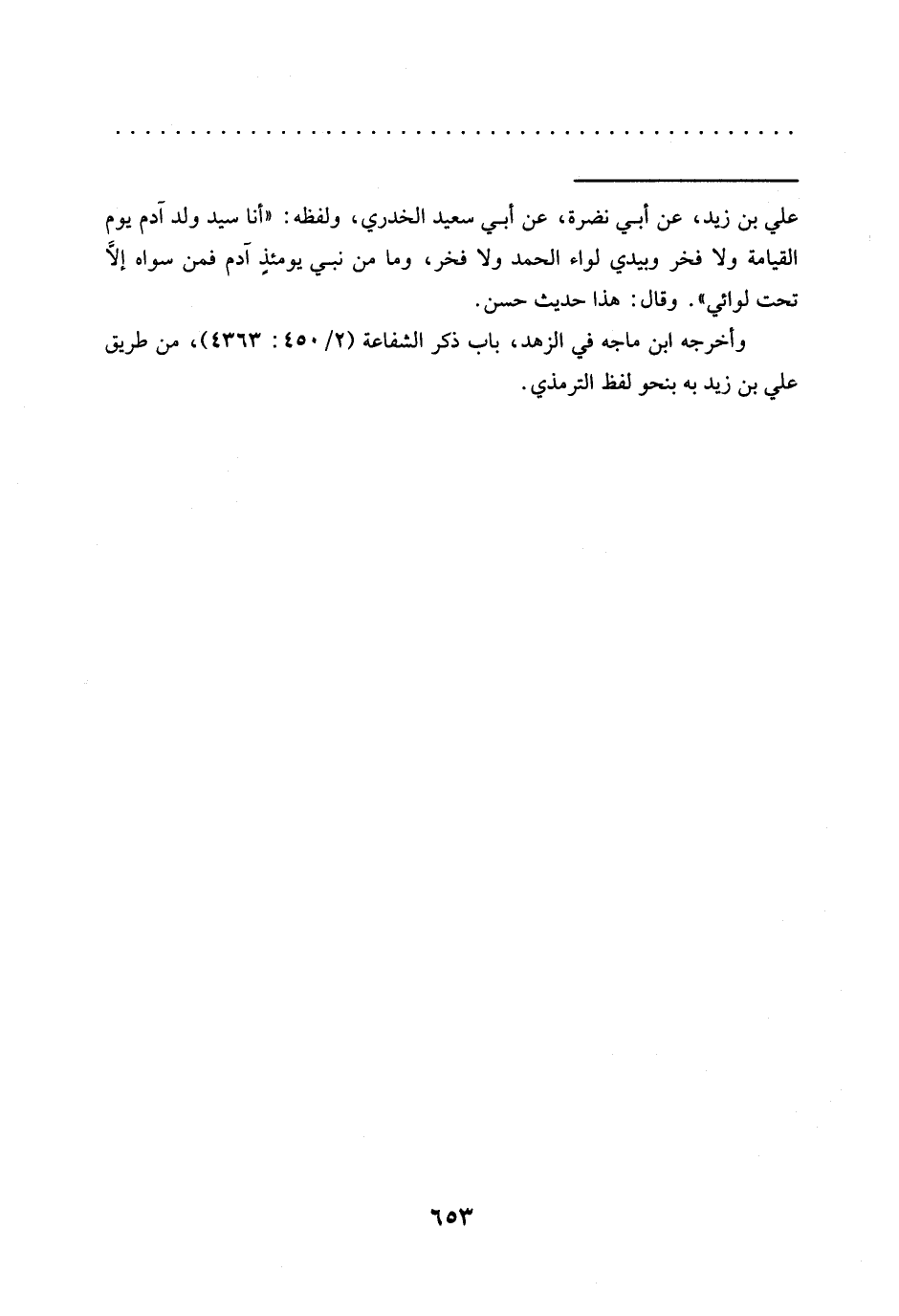 = علي بن زيد، عن أبي نضرة، عن أبي سعيد الخدري، ولفظه: "أنا سيد ولد آدم يوم القيامة ولا فخر وبيدي لواء الحمد ولا فخر، وما من نبي يومئذٍ آدم فمن سواه إلَّا تحت لوائي". وقال: هذا حديث حسن.