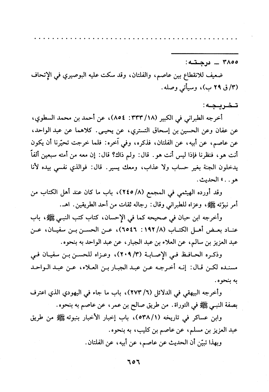 أخرجه الطبراني في الكبير (18/ 333: 854)، عن أحمد بن محمد السطوي، عن عفان وعن الحسين بن إسحاق التستري، عن يحيى. كلاهما عن عبد الواحد، عن عاصم، عن أبيه، عن الفلتان، فذكره، وفي آخره: فلما خرجت تحيّرنا أن يكون أَنْتَ هُوَ، فَنَظَرْنَا فَإِذَا لَيْسَ أَنْتَ هُوَ. قال: ولم ذاك؟ قال: إن معه من أمته سبعين ألفا يدخلون الجنة بغير حساب ولا عذاب، ومعك يسير. قال: فوالذي نفسي بيده لأنا هو .. " الحديث.