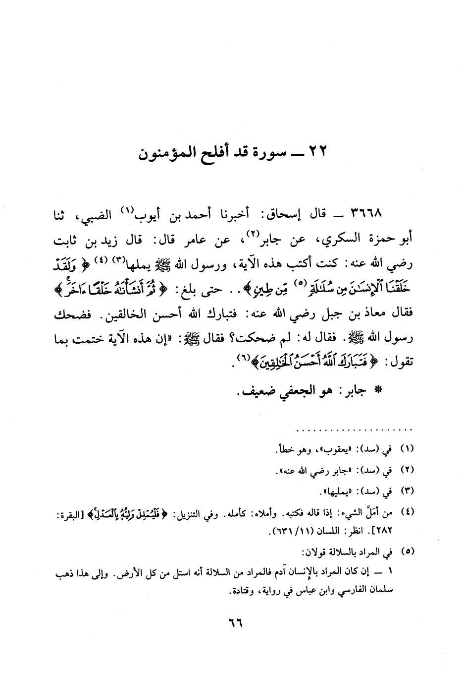 3668 - قَالَ إِسْحَاقُ: أخبرنا أَحْمَدُ بْنُ أَيُّوبَ الضَّبِّيُّ، ثنا أَبُو حَمْزَةَ السُّكَّرِيُّ، عَنْ جَابِرٍ، عَنْ عَامِرٍ قَالَ: قَالَ زَيْدُ بْنُ ثَابِتٍ رَضِيَ الله عَنْه: §كُنْتُ أَكْتُبُ هَذِهِ الْآيَةَ، وَرَسُولُ اللَّهِ صَلَّى اللَّهُ عَلَيْهِ وَسَلَّمَ يملها {وَلَقَدْ خَلَقْنَا الْإِنْسَانَ مِنْ سُلَالَةٍ مِنْ طِينٍ} . . حَتَّى بَلَغَ: {ثُمَّ أَنْشَأْنَاهُ خَلْقًاءَاخَرَ} فَقَالَ مُعَاذُ بْنُ جَبَلٍ رَضِيَ الله عَنْه: فَتَبَارَكَ اللَّهُ أَحْسَنُ الْخَالِقِينَ. فَضَحِكَ رَسُولُ اللَّهِ صَلَّى اللَّهُ عَلَيْهِ وَسَلَّمَ. فَقَالَ لَهُ: لَمْ ضَحِكْتَ؟ فَقَالَ صَلَّى اللَّهُ عَلَيْهِ وَسَلَّمَ: " إِنَّ هَذِهِ الْآيَةَ خُتِمَتْ بِمَا تَقُولُ: {فَتَبَارَكَ اللَّهُ أَحْسَنُ الْخَالِقِينَ} .