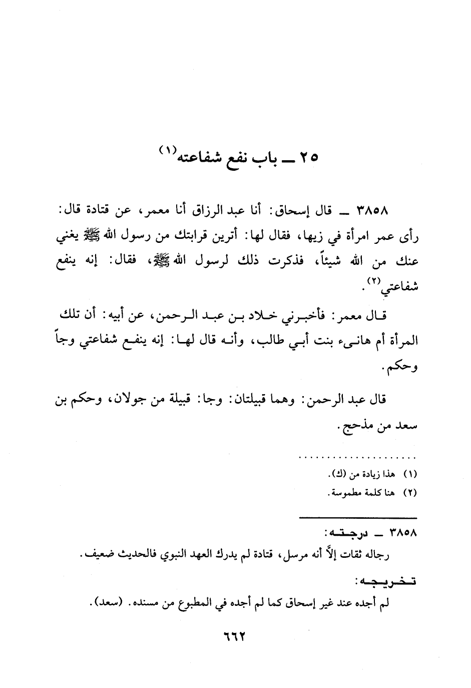 3858 - قَالَ إِسْحَاقُ: أنا عَبْدُ الرَّزَّاقِ أنا مَعْمَرٍ، عَنْ قَتَادَةَ قَالَ: رَأَى عُمَرُ امْرَأَةً فِي زِيِّهَا، فَقَالَ لَهَا: §أَتَرَيْنَ قَرَابَتَكِ مِنْ رَسُولِ اللَّهِ صَلَّى اللَّهُ عَلَيْهِ وَسَلَّمَ يغني عَنْكِ مِنَ اللَّهِ شَيْئًا، فَذَكَرَتْ ذَلِكَ لِرَسُولِ اللَّهِ صَلَّى اللَّهُ عَلَيْهِ وَسَلَّمَ، فَقَالَ: إِنَّهُ يَنْفَعُ شَفَاعَتِي.