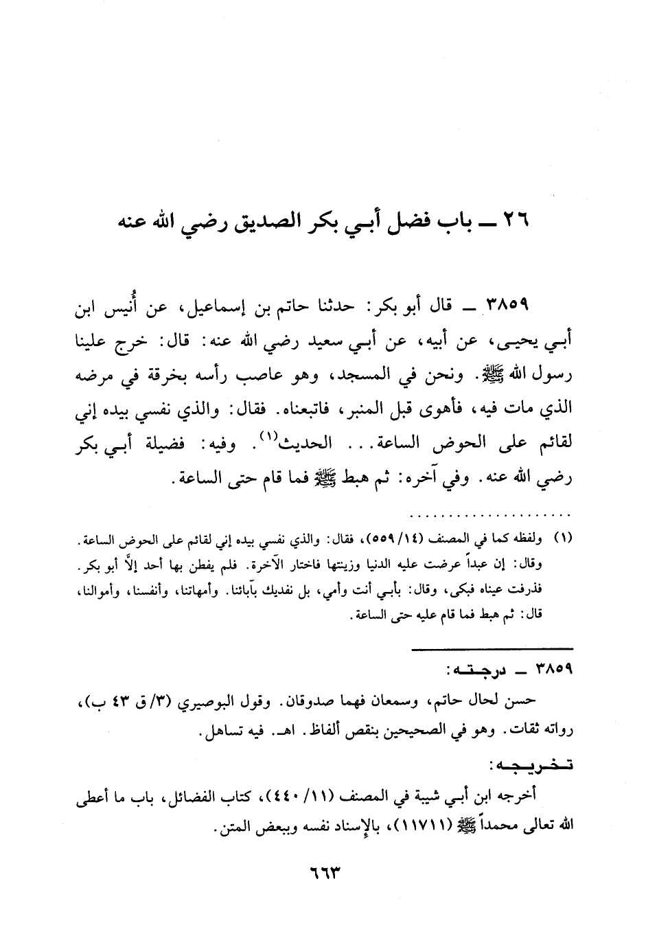 3859 - قَالَ أَبُو بَكْرٍ: حدثنا حَاتِمُ بْنُ إِسْمَاعِيلَ، عَنْ أُنَيْسِ ابن أَبِي يَحْيَى، عَنْ أَبِيهِ، عَنْ أَبِي سَعِيدٍ رَضِيَ الله عَنْه: قَالَ: §خَرَجَ علينا رَسُولُ اللَّهِ صَلَّى اللَّهُ عَلَيْهِ وَسَلَّمَ. وَنَحْنُ فِي الْمَسْجِدِ، وَهُوَ عَاصِبٌ رَأْسَهُ بِخِرْقَةٍ فِي مَرَضِهِ الَّذِي مَاتَ فِيهِ، فَأَهْوَى قِبَلَ الْمِنْبَرِ، فَاتَّبَعْنَاهُ. فَقَالَ: وَالَّذِي نَفْسِي بِيَدِهِ إِنِّي لَقَائِمٌ عَلَى الْحَوْضِ السَّاعَةَ ... الْحَدِيثَ. وَفِيهِ: فَضِيلَةُ أَبِي بَكْرٍ رَضِيَ الله عَنْه. وَفِي آخِرِهِ: ثُمَّ هَبَطَ صَلَّى اللَّهُ عَلَيْهِ وَسَلَّمَ فَمَا قَامَ حَتَّى السَّاعَةِ.