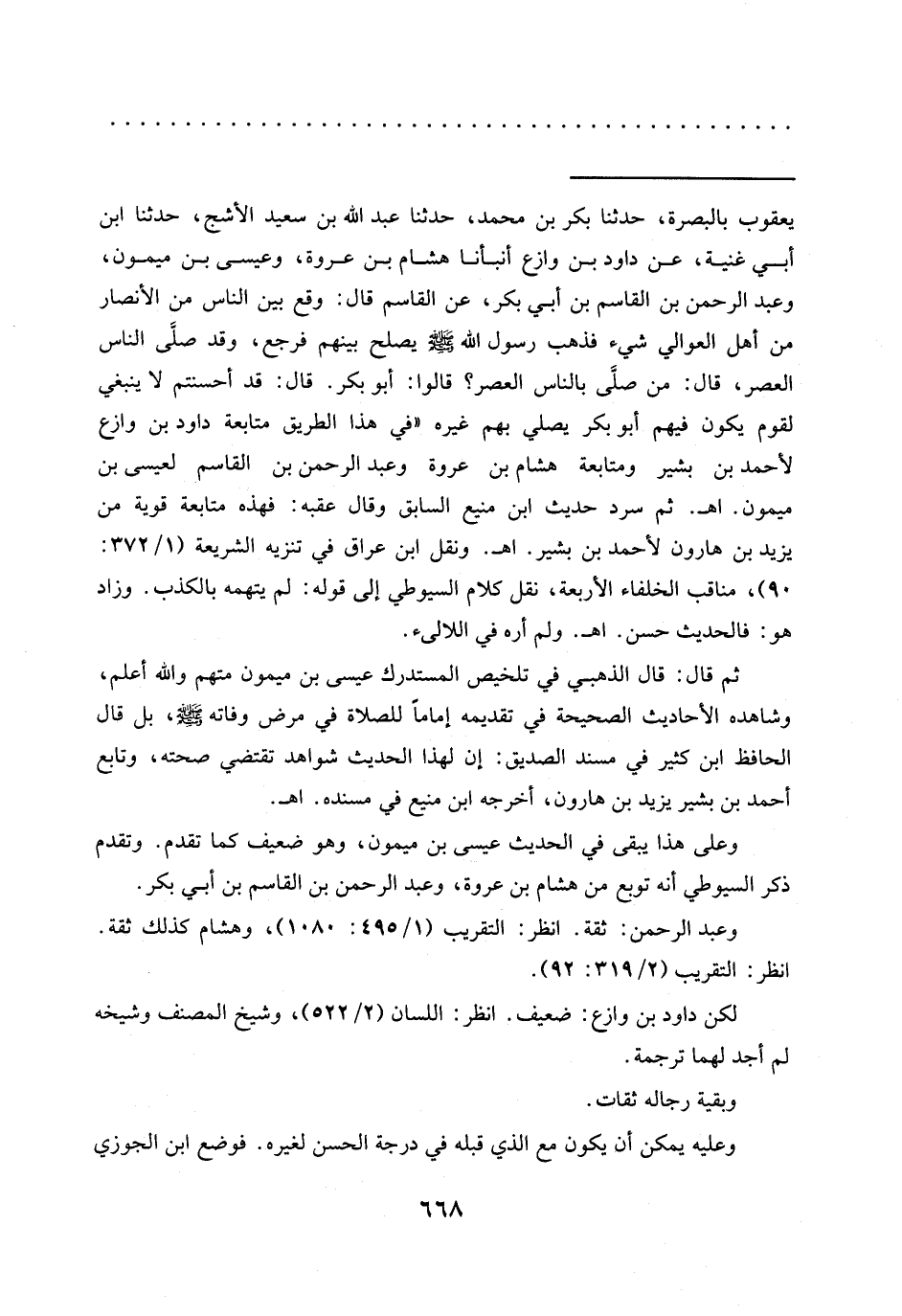 = يعقوب بالبصرة، حدّثنا بكر بن محمد، حدّثنا عبد الله بن سعيد الأشج، حدّثنا ابن أبي غنية، عن داود بن وازع أنبأنا هشام بن عروة، وعيسى بن ميمون، وعبد الرحمن بن القاسم بن أبي بكر، عن القاسم قال: وقع بين الناس من الأنصار من أهل العوالي شيء فذهب رسول الله -صلى الله عليه وسلم- يصلح بينهم فرجع، وقد صلَّى الناس العصر، قال: من صلَّى بالناس العصر؟ قالوا: أبو بكر. قال: قد أحسنتم لا ينبغي لقوم يكون فيهم أبو بكر يصلي بهم غيره "في هذا الطريق متابعة داود بن وازع لأحمد بن بشير ومتابعة هشام بن عروة وعبد الرحمن بن القاسم لعيسى بن ميمون." اهـ. ثم سرد حديث ابن منيع السابق وقال عقبه: فهذه متابعة قوية من يزيد بن هارون لأحمد بن بشير. اهـ. ونقل ابن عراق في تنزيه الشريعة (1/ 372: 90)، مناقب الخلفاء الأربعة، نقل كلام السيوطي إلى قوله: لم يتهمه بالكذب. وزاد هو: فالحديث حسن. اهـ. ولم أره في اللآلىء.