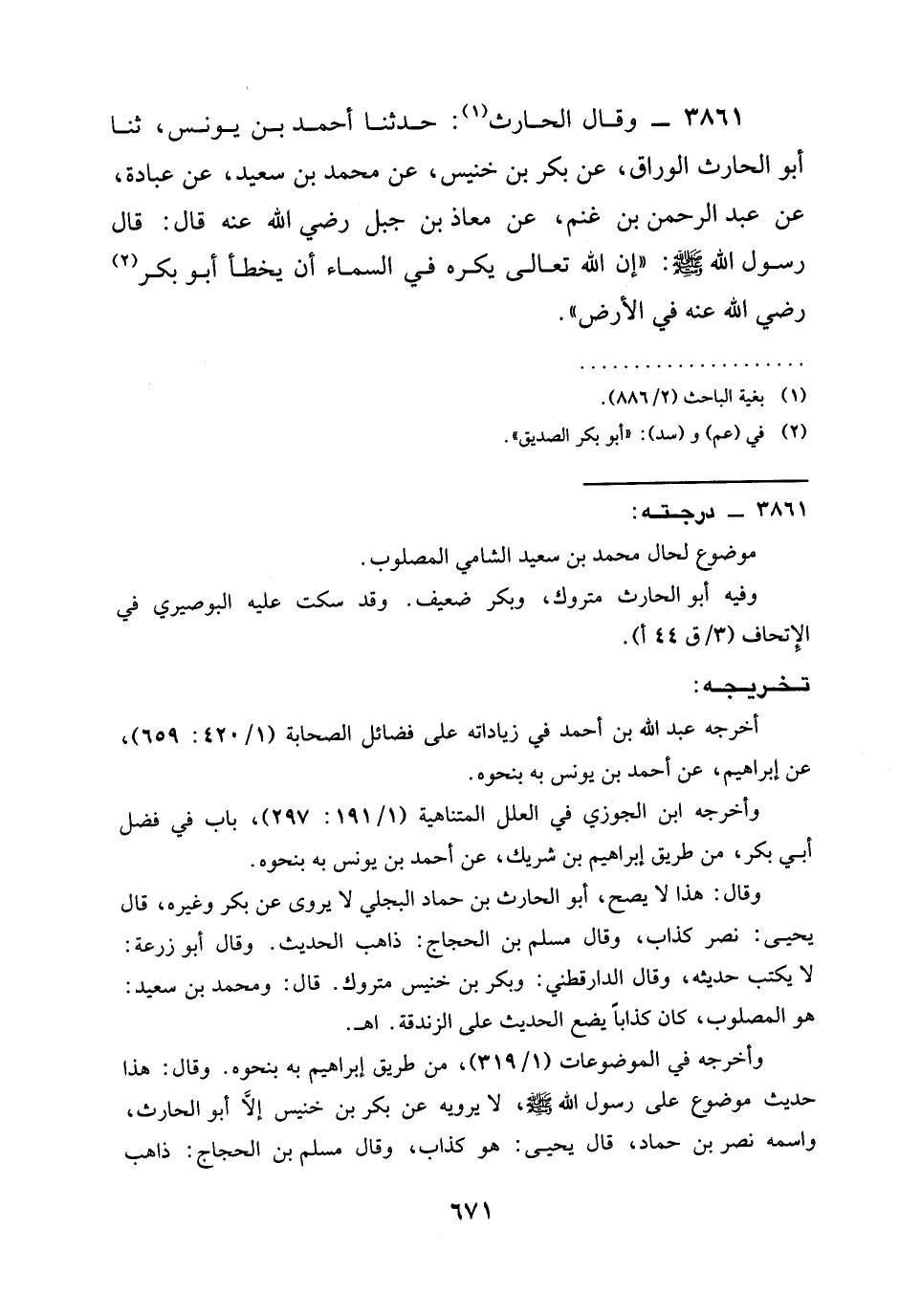 3861 - وَقَالَ الْحَارِثُ: حدثنا أَحْمَدُ بْنُ يُونُسَ، ثنا أَبُو الْحَارِثِ الْوَرَّاقُ، عَنْ بَكْرِ بْنِ خُنَيْسٍ، عَنْ مُحَمَّدِ بْنِ سَعِيدٍ، عَنْ عُبَادَةَ، عَنْ عَبْدِ الرَّحْمَنِ بْنِ غَنْمٍ، عَنْ مُعَاذِ بْنِ جَبَلٍ رَضِيَ الله عَنْه قَالَ: قَالَ رَسُولُ اللَّهِ صَلَّى اللَّهُ عَلَيْهِ وَسَلَّمَ: " إن §الله تعالى يَكْرَهُ فِي السَّمَاءِ أَنْ يُخَطَّأَ أَبُو بَكْرٍ رَضِيَ الله عَنْهُ فِي الْأَرْضِ ".