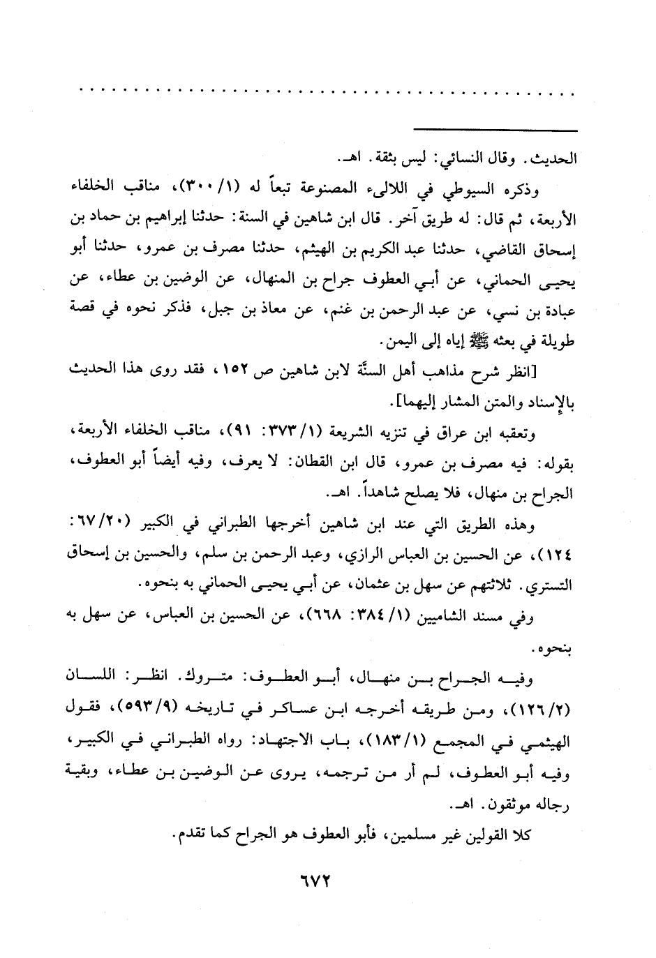 وتعقبه ابن عراق في تنزيه الشريعة (1/ 373: 91)، مناقب الخلفاء الأربعة، بقوله: فيه مصرف بن عمرو، قال ابن القطان: لا يعرف، وفيه أيضًا أبو العطوف، الجراح بن منهال، فلا يصلح شاهدًا. اهـ.
