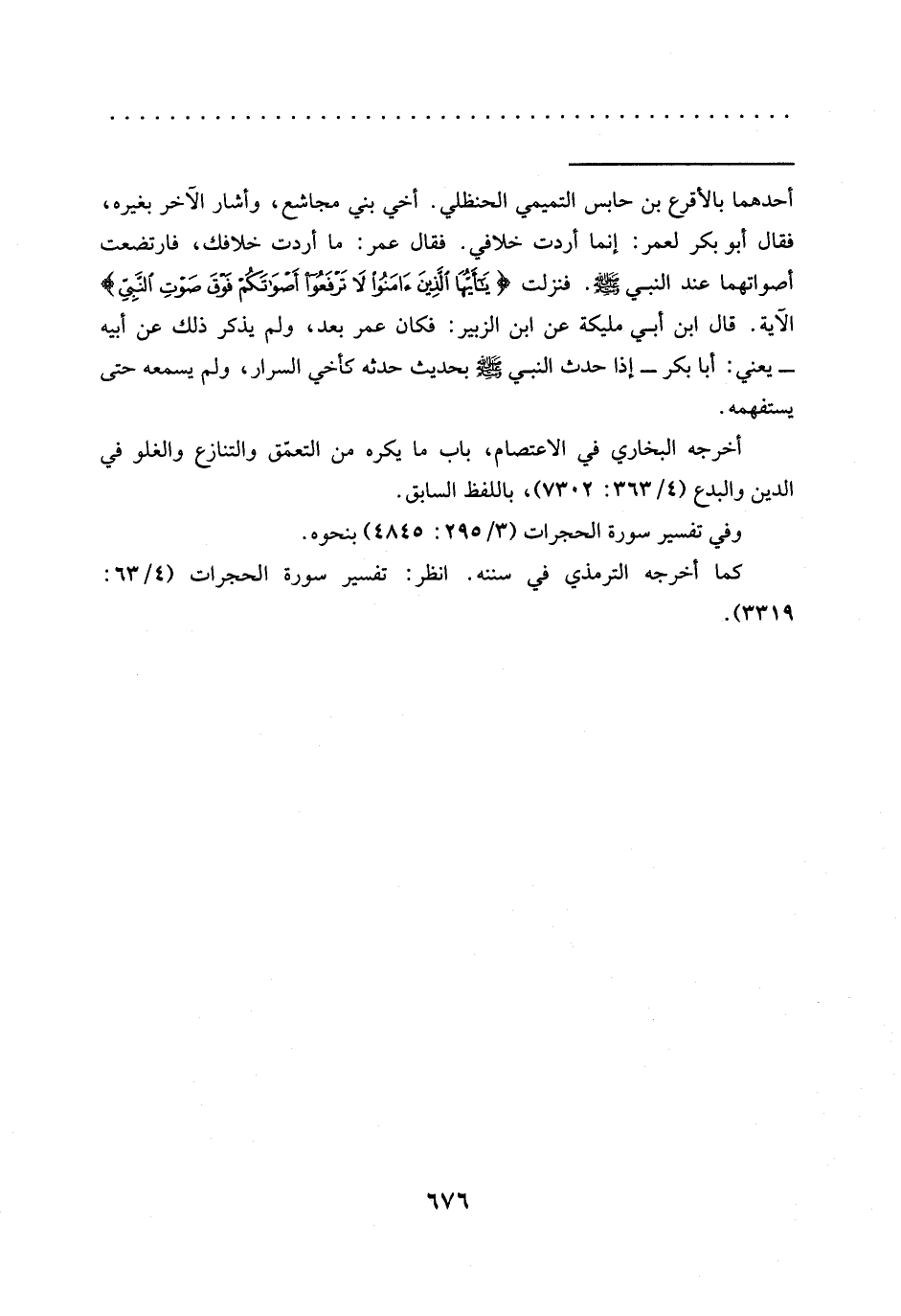 = أحدهما بالأقرع بن حابس التميمي الحنظلي. أخي بني مجاشع، وأشار الآخر بغيره، فقال أبو بكر لعمر: إنما أردت خلافي. فقال عمر: ما أردت خلافك، فارتضعت أصواتهما عند النبي -صلى الله عليه وسلم-. فنزلت {يَا أَيُّهَا الَّذِينَ آمَنُوا لَا تَرْفَعُوا أَصْوَاتَكُمْ فَوْقَ صَوْتِ النَّبِيِّ} الآية. قال ابن أبي مليكة عن ابن الزبير: فكان عمر بعد، ولم يذكر ذلك عن أبيه -يعني: أبا بكر- إذا حدث النبي -صلى الله عليه وسلم- بحديث حدثه كأخي السرار، ولم يسمعه حتى يستفهمه.