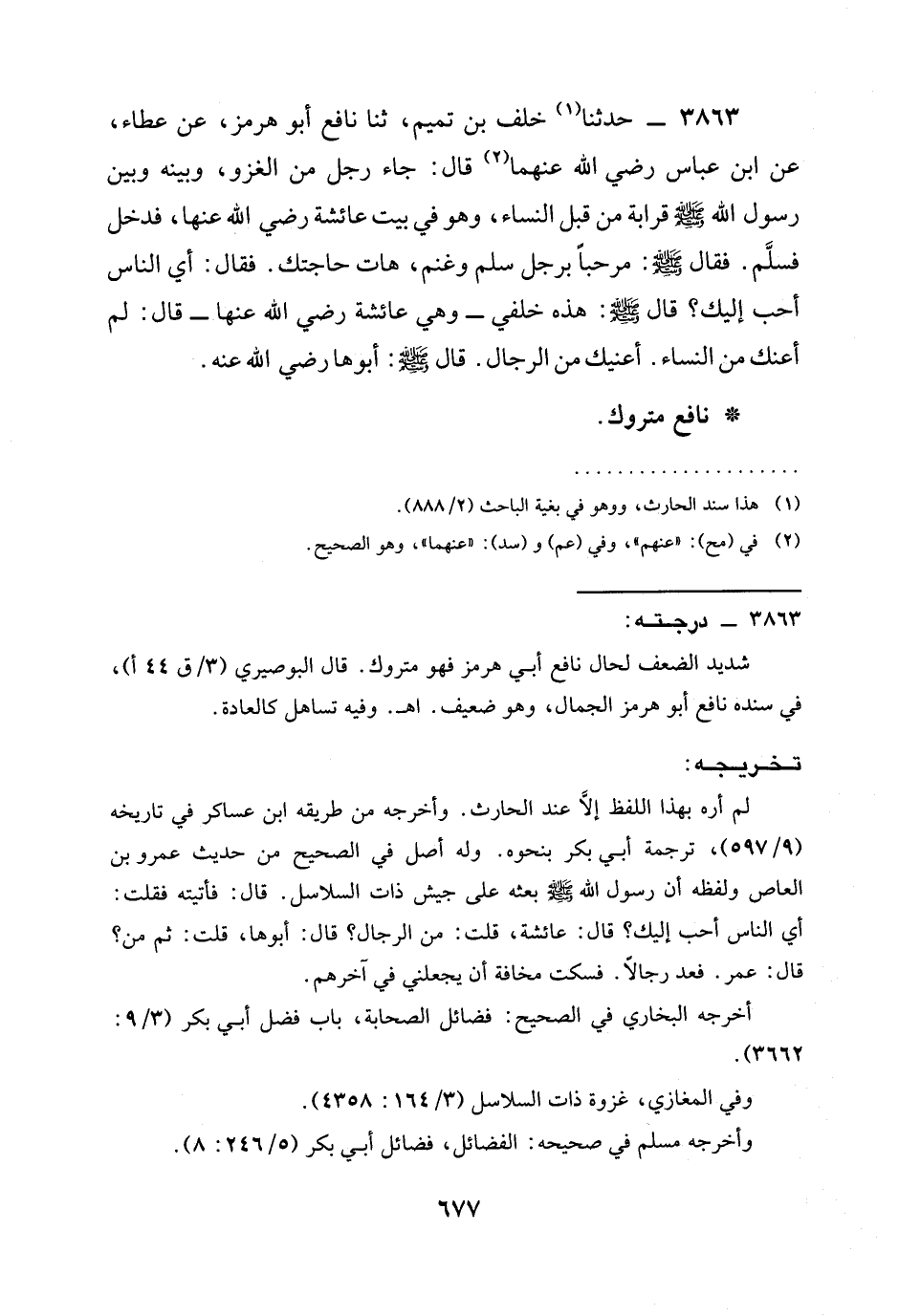 3863 - حدثنا خَلَفُ بْنُ تَمِيمٍ، ثنا نَافِعٌ أَبُو هُرْمُزَ، عَنْ عَطَاءٍ، عَنِ ابن عباس رَضِيَ الله عَنْهما قَالَ: جَاءَ رَجُلٌ مِنَ الْغَزْوِ، وَبَيْنَهُ وَبَيْنَ رَسُولِ اللَّهِ صَلَّى اللَّهُ عَلَيْهِ وَسَلَّمَ قَرَابَةٌ مِنْ قِبَلِ النِّسَاءِ، وَهُوَ فِي بيت عائشة رَضِيَ الله عَنْها، فَدَخَلَ فَسَلَّمَ. فَقَالَ صَلَّى اللَّهُ عَلَيْهِ وَسَلَّمَ: مَرْحَبًا بِرَجُلٍ سَلِمَ وَغَنِمَ، هَاتِ حَاجَتَكَ. فَقَالَ: §أَيُّ النَّاسِ أَحَبُّ إِلَيْكَ؟ قَالَ صَلَّى اللَّهُ عَلَيْهِ وَسَلَّمَ: هَذِهِ خَلْفِي - وهي عائشة رَضِيَ الله عَنْها - قَالَ: لَمْ أَعْنِكَ مِنَ النِّسَاءِ. أَعْنِيكَ مِنَ الرِّجَالِ. قَالَ صَلَّى اللَّهُ عَلَيْهِ وَسَلَّمَ: أَبُوهَا رَضِيَ الله عَنْه.
