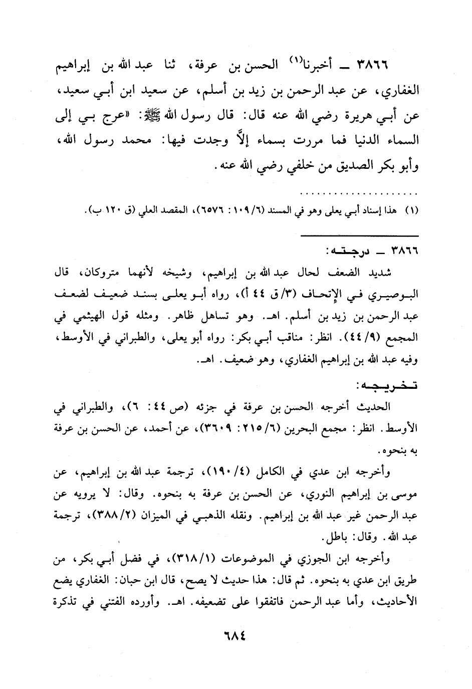 3866 - أَخْبَرَنَا الْحَسَنُ بْنُ عَرَفَةَ، ثنا عَبْدُ اللَّهِ بْنُ إِبْرَاهِيمَ الْغِفَارِيُّ، عَنْ عَبْدِ الرَّحْمَنِ بْنِ زَيْدِ بْنِ أَسْلَمَ، عَنْ سَعِيدِ ابن أَبِي سَعِيدٍ، عَنْ أَبِي هُرَيْرَةَ رَضِيَ الله عَنْه قَالَ: قَالَ رَسُولُ اللَّهِ صَلَّى اللَّهُ عَلَيْهِ وَسَلَّمَ: " §عُرِجَ بِي إِلَى السَّمَاءِ الدُّنْيَا فَمَا مَرَرْتُ بِسَمَاءٍ إِلَّا وَجَدْتُ فِيهَا: مُحَمَّدٌ رَسُولُ اللَّهِ، وَأَبُو بَكْرٍ الصِّدِّيقُ مِنْ خَلْفِي رَضِيَ الله عَنْه.