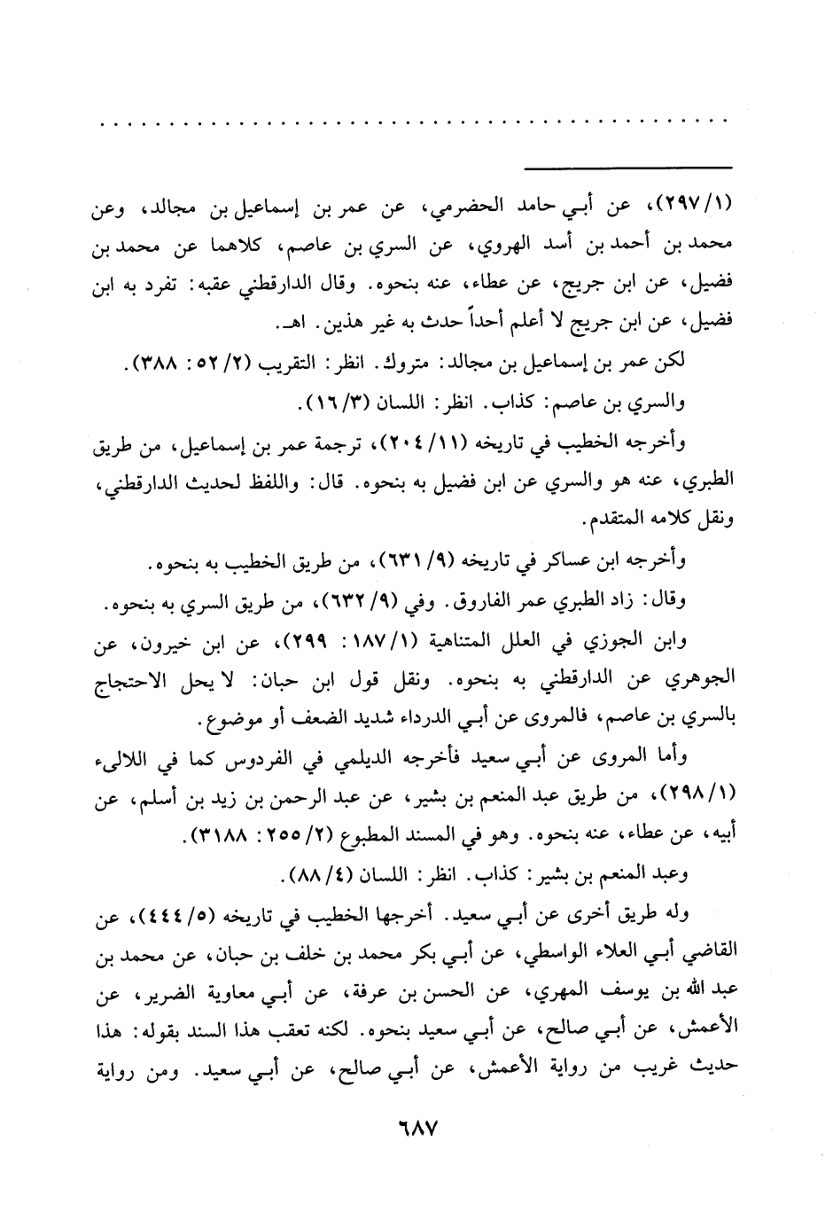 = (1/ 297)، عن أبي حامد الحضرمي، عن عمر بن إسماعيل بن مجالد، وعن محمد بن أحمد بن أسد الهروي، عن السري بن عاصم، كلاهما عن محمد بن فضيل، عن ابن جريج، عن عطاء، عنه بنحوه. وقال الدارقطني عقبه: تفرد به ابن فضيل، عن ابن جريج لا أعلم أحدًا حدث به غير هذين. اهـ.