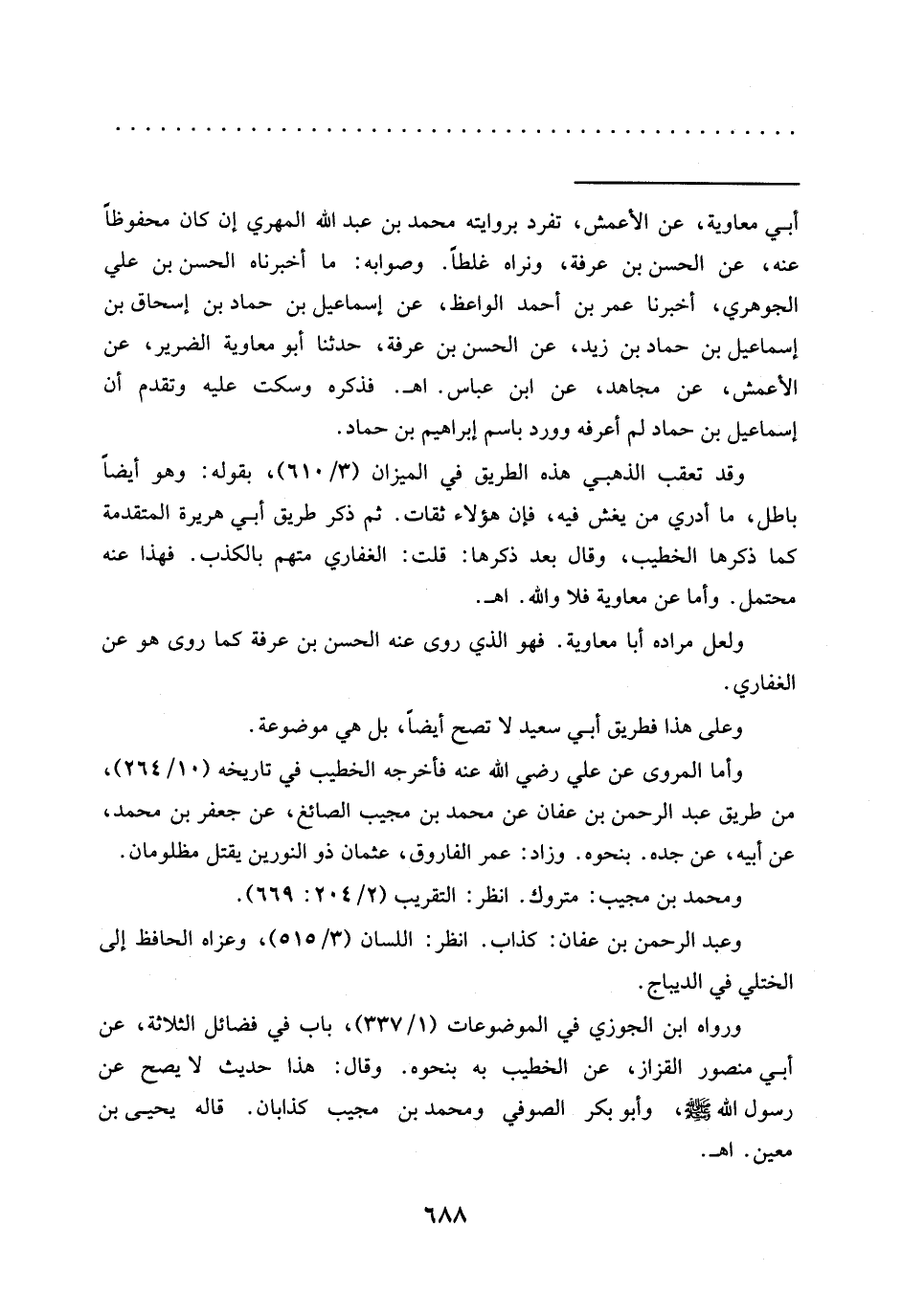 = أبي معاوية، عن الأعمش، تفرد بروايته محمد بن عبد الله المهري إن كان محفوظًا عنه، عن الحسن بن عرفة، ونراه غلطًا. وصوابه: ما أخبرناه الحسن بن علي الجوهري، أخبرنا عمر بن أحمد الواعظ، عن إسماعيل بن حماد بن إسحاق بن إسماعيل بن حماد بن زيد، عن الحسن بن عرفة، حدّثنا أبو معاوية الضرير، عن الأعمش، عن مجاهد، عن ابن عباس. اهـ. فذكره وسكت عليه وتقدم أن إسماعيل بن حماد لم أعرفه وورد باسم إبراهيم بن حماد.