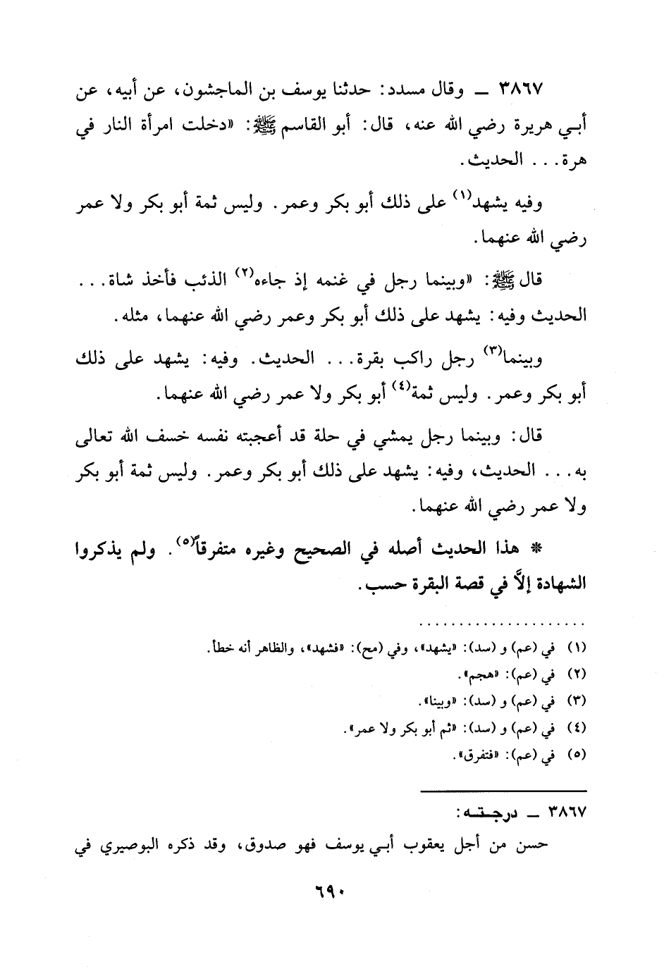 3867 - وَقَالَ مُسَدَّدٌ: حدثنا يُوسُفُ بْنُ الْمَاجِشُونِ، عَنْ أَبِيهِ، عَنْ أَبِي هُرَيْرَةَ رَضِيَ الله عَنْه، قَالَ: أَبُو الْقَاسِمِ صَلَّى اللَّهُ عَلَيْهِ وَسَلَّمَ: " §دَخَلَتِ امْرَأَةٌ النَّارَ فِي هِرَّةٍ. . الْحَدِيثَ.