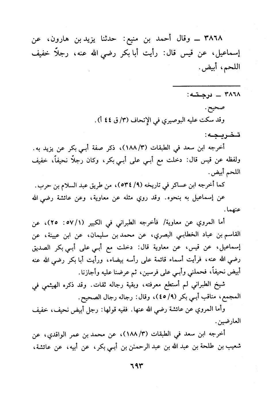 3868 - وَقَالَ أَحْمَدُ بْنُ مَنِيعٍ: حدثنا يَزِيدُ بْنُ هَارُونَ، عَنْ إِسْمَاعِيلَ، عَنْ قَيْسٍ قَالَ: §رَأَيْتُ أَبَا بَكْرٍ رَضِيَ الله عَنْه، رَجُلًا خَفِيفَ اللَّحْمِ، أَبْيَضَ.