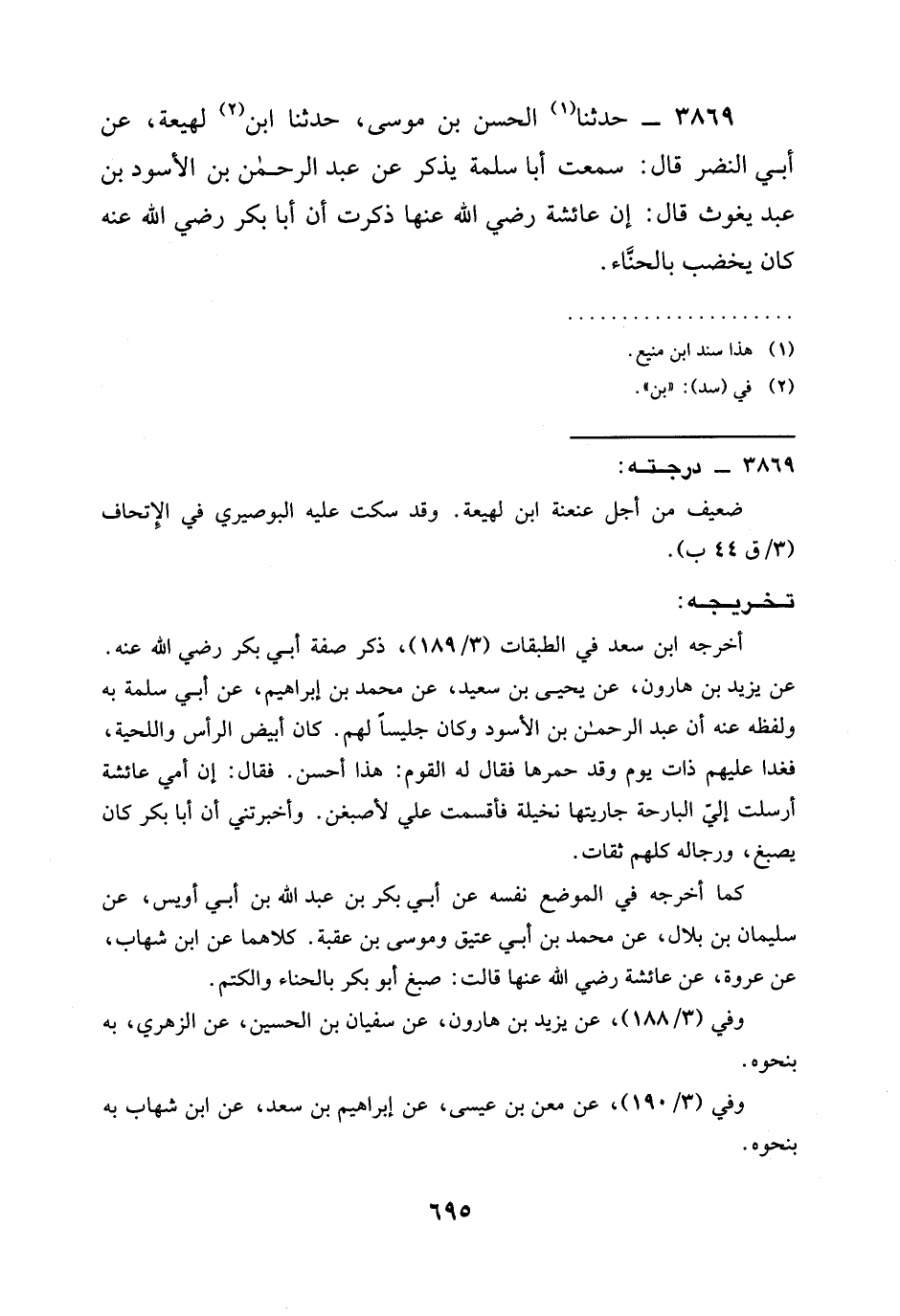 3869 - حدثنا الْحَسَنُ بْنُ مُوسَى، حدثنا ابْنُ لَهِيعَةَ، عَنْ أَبِي النَّضْرِ قَالَ: سَمِعْتُ أَبَا سَلَمَةَ يَذْكُرُ عَنْ عَبْدِ الرَّحْمَنِ بْنِ الْأَسْوَدِ بْنِ عَبْدِ يَغُوثَ قَالَ: إن عائشة رَضِيَ الله عَنْها ذَكَرَتْ أَنَّ §أَبَا بَكْرٍ رَضِيَ الله عَنْه كَانَ يَخْضِبُ بِالْحِنَّاءِ.