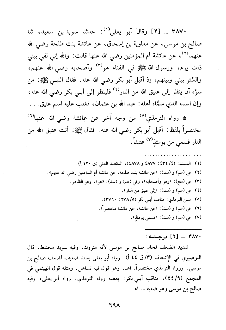 3870 -[2] وَقَالَ أَبُو يَعْلَى: حدثنا سُوَيْدُ بْنُ سَعِيدٍ، ثنا صَالِحُ بْنُ مُوسَى، عَنْ مُعَاوِيَةَ بْنِ إِسْحَاقَ، عَنْ عَائِشَةَ بِنْتِ طلحة رَضِيَ الله عَنْهما، عَنْ عَائِشَةَ أم المؤمنين رَضِيَ الله عَنْها قَالَتْ: وَاللَّهِ إِنِّي لَفِي بَيْتِي ذَاتَ يَوْمٍ، وَرَسُولُ اللَّهِ صَلَّى اللَّهُ عَلَيْهِ وَسَلَّمَ فِي الْفِنَاءِ هو وأصحابه رَضِيَ الله عَنْهم، وَالسِّتْرُ بَيْنِي وَبَيْنَهُمْ، إِذْ أَقْبَلَ أَبُو بَكْرٍ رَضِيَ الله عَنْه. فَقَالَ النَّبِيُّ صَلَّى اللَّهُ عَلَيْهِ وَسَلَّمَ: §مَنْ سَرَّهُ أَنْ يَنْظُرَ إِلَى عَتِيقِ اللَّهِ مِنَ النَّارِ فَلْيَنْظُرْ إِلَى أَبِي بَكْرٍ رَضِيَ الله عَنْه، وَإِنَّ اسْمَهُ الَّذِي سَمَّاهُ أَهْلُهُ: عَبْدُ اللَّهِ بْنُ عُثْمَانَ، فَغَلَبَ عَلَيْهِ اسْمُ عَتِيقٍ ...