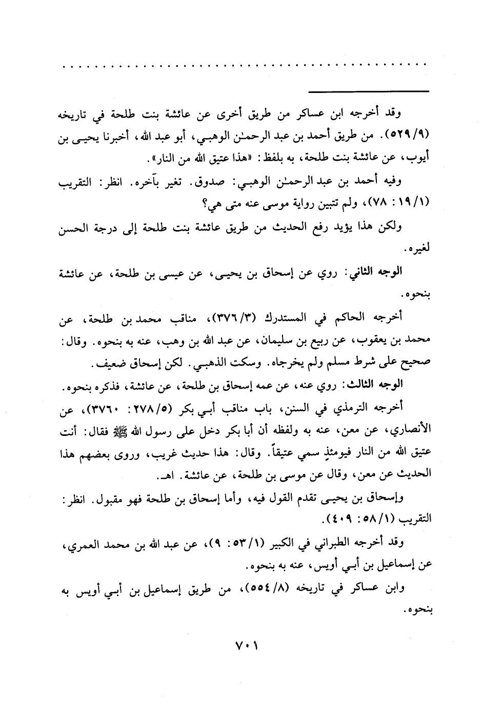 = وقد أخرجه ابن عساكر من طريق أخرى عن عائشة بنت طلحة في تاريخه (9/ 529). من طريق أحمد بن عبد الرحمن الوهبي، أبو عبد الله، أخبرنا يحيى بن أيوب، عن عائشة بنت طلحة، به بلفظ: "هذا عتيق الله من النار".