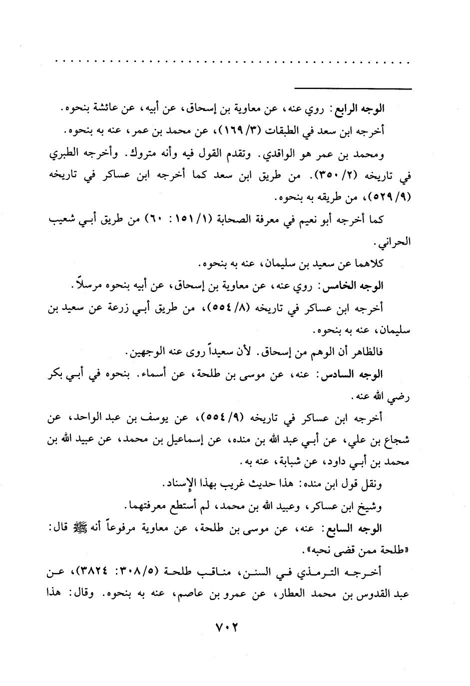 الوجه السابع: عنه، عن موسى بن طلحة، عن معاوية مرفوعًا أنه -صلى الله عليه وسلم- قال: "طلحة ممن قضى نحبه".