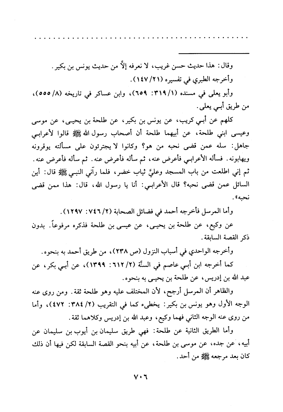 كلهم عن أبي كريب، عن يُونُسُ بْنُ بُكَيْرٍ، عَنْ طَلْحَةَ بْنِ يَحْيَى، عن موسى وعيسى ابني طلحة، عن أبيهما طلحة أَنَّ أَصْحَابَ رَسُولِ اللَّهِ -صَلَّى اللَّهُ عَلَيْهِ وسلم- قالوا لأعرابي جاهل: سله عمن قضى نحبه من هو؟ وكانوا لا يجترئون على مسألته يوقرونه ويهابونه. فسأله الأعرابي فأعرض عنه، ثم سأله فأعرض عنه. ثم سأله فأعرض عنه.