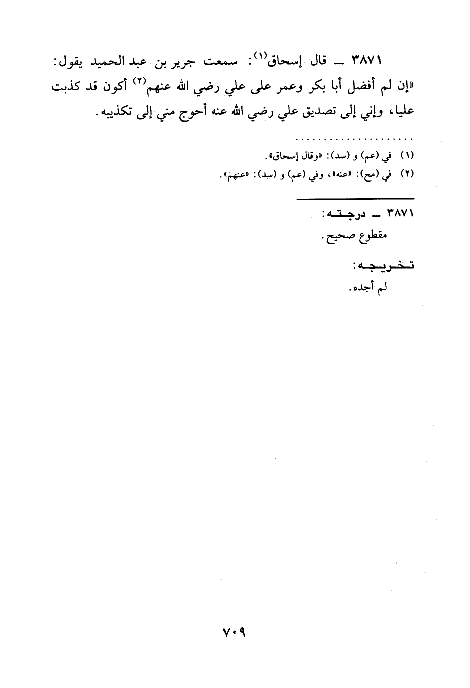 3871 - قَالَ إِسْحَاقُ: سَمِعْتُ جَرِيرَ بْنَ عَبْدِ الْحَمِيدِ يَقُولُ: " §إِنْ لَمْ أُفَضِّلْ أَبَا بَكْرٍ وَعُمَرَ على علي رَضِيَ الله عَنْهم أكون قَدْ كَذَبْتُ عَلِيًّا، وَإِنِّي إِلَى تَصْدِيقِ عَلِيٍّ رَضِيَ الله عَنْه أَحْوَجُ مِنِّي إِلَى تَكْذِيبِهِ.