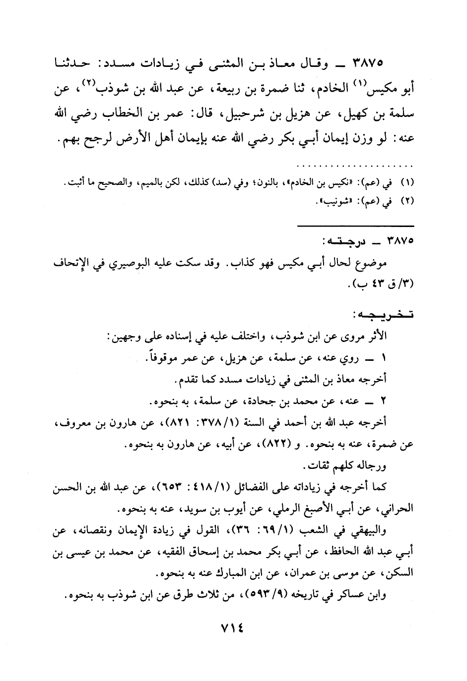 3875 - وَقَالَ مُعَاذُ بْنُ الْمُثَنَّى فِي زِيَادَاتِ مسدد: حدثنا أبو مَكِيسُ الْخَادِمِ، ثنا ضَمْرَةُ بْنُ رَبِيعَةَ، عَنْ عَبْدِ اللَّهِ بْنِ شَوْذَبٍ، عَنْ سَلَمَةَ بْنِ كُهَيْلٍ، عَنْ هُزَيْلِ بْنِ شُرَحْبِيلَ، قَالَ: عُمَرُ بن الخطاب رَضِيَ الله عَنْه: §لَوْ وُزِنَ إِيمَانُ أَبِي بَكْرٍ رَضِيَ الله عَنْه بِإِيمَانِ أَهْلِ الْأَرْضِ لَرَجَحَ بِهِمْ.