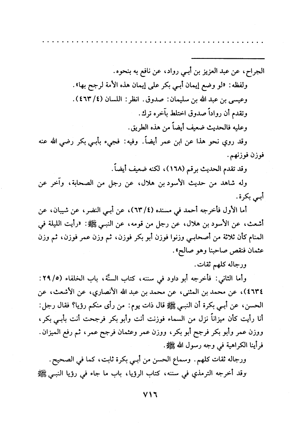 وأما الثاني: فأخرجه أبو داود في سننه، كتاب السنَّة، باب الخلفاء (5/ 29: 4634)، عن محمد بن المثنى، عن محمد بن عبد الله الأنصاري، عن الأشعث، عن الحسن، عن أبي بكرة أن النبي -صلى الله عليه وسلم- قال ذات يوم: من رأى منكم رؤيا؟ فقال رجل: أنا رأيت كان ميزانًا نزل من السماء فوزنت أنت وأبو بكر فرجحت أنت بأبي بكر، ووزن عمر وأبو بكر فرجح أبو بكر، ووزن عمر وعثمان فرجح عمر، ثم رفع الميزان.