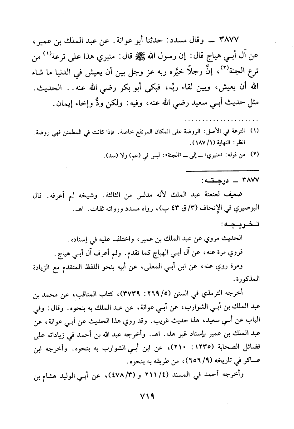 3877 - وَقَالَ مُسَدَّدٌ: حدثنا أَبُو عَوَانَةَ. عَنْ عَبْدِ الْمَلِكِ بْنِ عُمَيْرٍ، عَنْ آلِ أَبِي هَيَّاجٍ قَالَ: إِنَّ رَسُولَ اللَّهِ صَلَّى اللَّهُ عَلَيْهِ وَسَلَّمَ قَالَ: §مِنْبَرِي هَذَا عَلَى تُرْعَةٍ مِنْ تُرَعِ الْجَنَّةِ، إِنَّ رَجُلًا خَيَّرَهُ رَبُّهُ عَزَّ وَجَلَّ بَيْنَ أَنْ يَعِيشَ فِي الدُّنْيَا مَا شَاءَ اللَّهُ أَنْ يَعِيشَ، وَبَيْنَ لِقَاءِ رَبِّهِ، فَبَكَى أَبُو بَكْرٍ رَضِيَ الله عَنْه ... الْحَدِيثَ. مِثْلُ حَدِيثِ أَبِي سَعِيدٍ رَضِيَ الله عَنْه، وَفِيهِ: وَلَكِنْ وُدٌّ وَإِخَاءُ إِيمَانٍ.