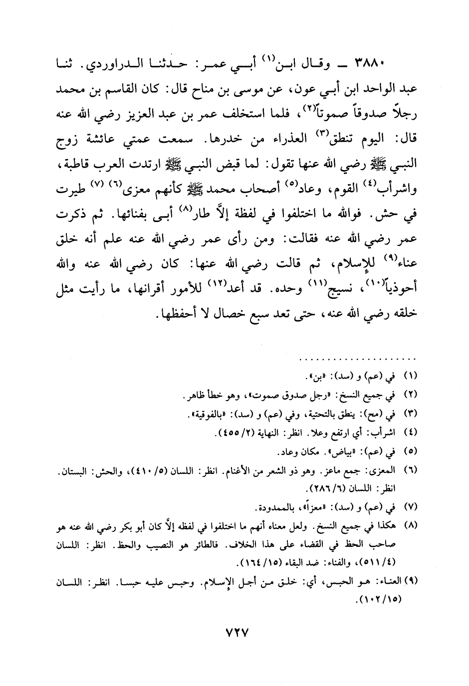 3880 - وَقَالَ ابْنُ أَبِي عُمَرَ: حدثنا الدَّرَاوَرْدِيُّ. ثنا عَبْدُ الْوَاحِدِ ابن أَبِي عَوْنٍ، عَنْ مُوسَى بْنِ مَنَّاحٍ قَالَ: كَانَ الْقَاسِمِ بن محمد رجلاً صدوقاً صَمُوتًا، فَلَمَّا اسْتُخْلِفَ عُمَرُ بْنُ عَبْدِ الْعَزِيزِ رَضِيَ الله عَنْه قَالَ: الْيَوْمَ تَنْطِقُ الْعَذْرَاءُ مِنْ خِدْرِهَا. سَمِعْتُ عَمَّتِي عَائِشَةَ زوج النبي صَلَّى اللَّهُ عَلَيْهِ وَسَلَّمَ رَضِيَ الله عَنْها تَقُولُ: §لَمَّا قُبِضَ النَّبِيُّ صَلَّى اللَّهُ عَلَيْهِ وَسَلَّمَ ارْتَدَّتِ الْعَرَبُ قَاطِبَةً، وَاشْرَأَبَّ الْقَوْمُ، وعاد أَصْحَابُ مُحَمَّدٍ صَلَّى اللَّهُ عَلَيْهِ وَسَلَّمَ كَأَنَّهُمْ مِعْزَى طُيِّرَتْ فِي حَشٍّ. فَوَاللَّهِ مَا اخْتَلَفُوا فِي لَفْظَةٍ إِلَّا طَارَ أَبِي بِفِنَائِهَا. ثُمَّ ذَكَرْتُ عُمَرَ رَضِيَ الله عَنْه فَقَالَتْ: وَمَنْ رَأَى عُمَرَ رَضِيَ الله عَنْه عَلِمَ أنه خلق عناء لِلْإِسْلَامِ، ثم قالت رَضِيَ الله عَنْها: كَانَ رَضِيَ الله عَنْه والله أحوذياً، نسيج وَحْدَهُ. قَدْ أَعَدَّ لِلْأُمُورِ أَقْرَانَهَا، مَا رَأَيْتُ مِثْلَ خُلُقِهِ رَضِيَ الله عَنْه، حَتَّى تَعُدَّ سَبْعَ خِصَالٍ لَا أَحْفَظُهَا -[729]-.