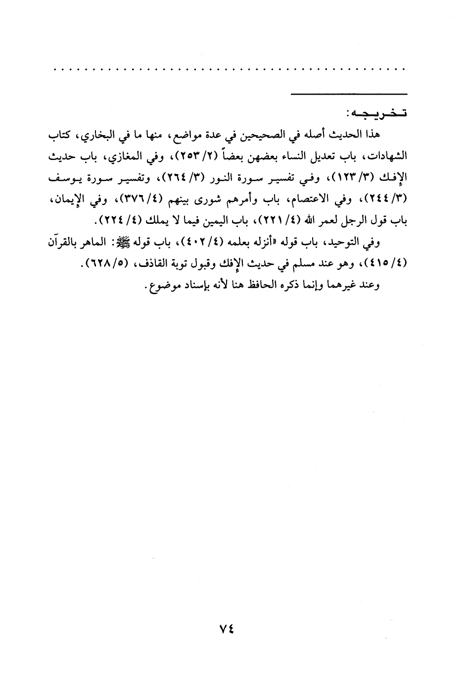 وفي التوحيد، باب قوله "أنزله بعلمه (4/ 402)، باب قوله -صلى الله عليه وسلم-: الماهر بالقرآن (4/ 415)، وهو عند مسلم في حديث الإِفك وقبول توبة القاذف، (5/ 628).