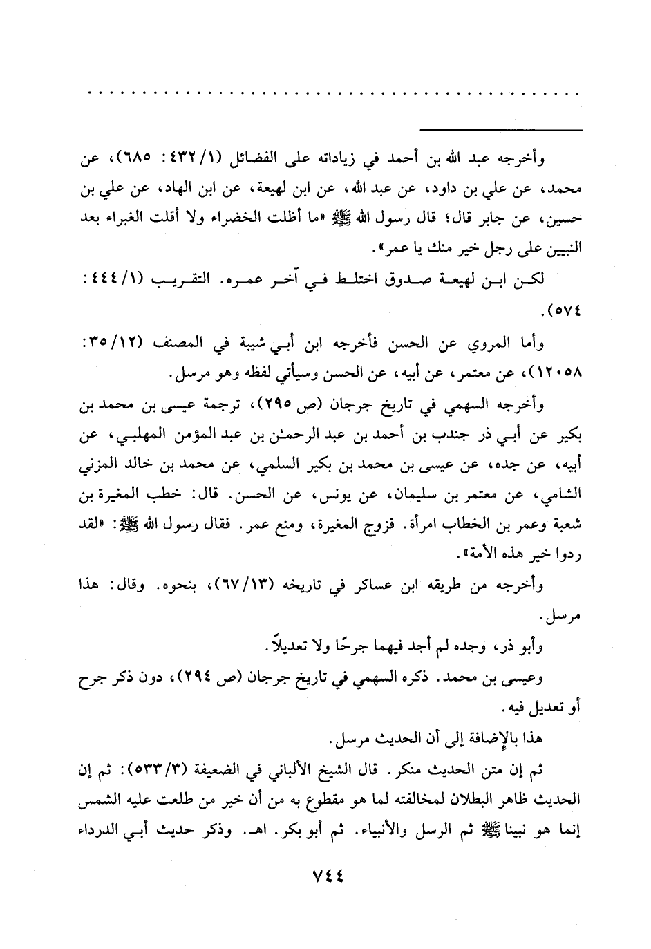 = وأخرجه عبد الله بن أحمد في زياداته على الفضائل (1/ 432: 685)، عن محمد، عن علي بن داود، عن عبد الله، عن ابن لهيعة، عن ابن الهاد، عن علي بن حسين، عَنْ جَابِرٍ قَالَ؟ قَالَ رَسُولُ اللَّهِ -صَلَّى اللَّهُ عَلَيْهِ وَسَلَّمَ- "مَا أَظَلَّتِ الْخَضْرَاءُ وَلَا أقلت الغبراء بعد النبيين على رجل خير منك يا عمر".