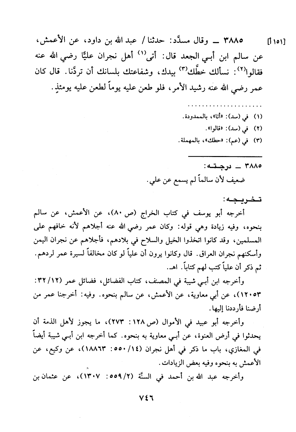 3885 - وقال مُسَدَّدٌ: حدثنا / عَبْدُ اللَّهِ بْنُ دَاوُدَ، عَنِ الْأَعْمَشِ، عَنْ سَالِمِ ابن أَبِي الْجَعْدِ قَالَ: أَتَى أَهْلُ نَجْرَانَ عَلِيًّا رَضِيَ الله عَنْه فَقَالُوا: نَسْأَلُكَ خَطَّكَ بِيَدِكِ، وَشَفَاعَتَكَ بِلِسَانِكَ أَنْ تَرُدَّنَا. قَالَ كَانَ §عُمَرُ رَضِيَ الله عَنْه رَشِيدَ الْأَمْرِ، فَلَوْ طُعِنَ عَلَيْهِ يَوْمًا لَطُعِنَ عَلَيْهِ يَوْمَئِذٍ.