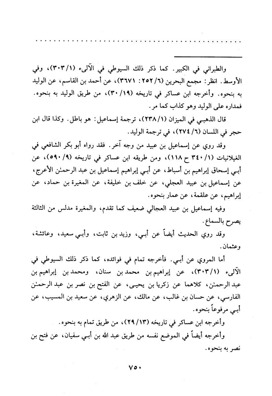 قال الذهبي في الميزان (1/ 238)، ترجمة إسماعيل: هو باطل. وكذا قال ابن حجر في اللسان (6/ 274)، في ترجمة الوليد.
