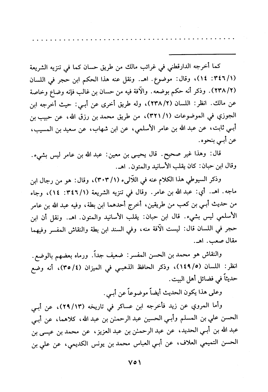 وذكر السيوطي هذا الكلام عنه في اللآلىء (1/ 303)، وقال: هو من رجال ابن ماجه. اهـ. أي: عبد الله بن عامر. وقال في تنزيه الشريعة (1/ 346: 14)، وجاء من حديث أُبي بن كعب من طريقين، أخرج أحدهما ابن بطة، وفيه عبد الله بن عامر الأسلمي ليس بشيء. قال ابن حبّان: يقلب الأسانيد والمتون. اهـ. ونقل أن ابن حجر في اللسان قال: ليست الآفة منه، وفي السند ابن بطة والنقاش المفسر وفيهما مقال صعب. اهـ.