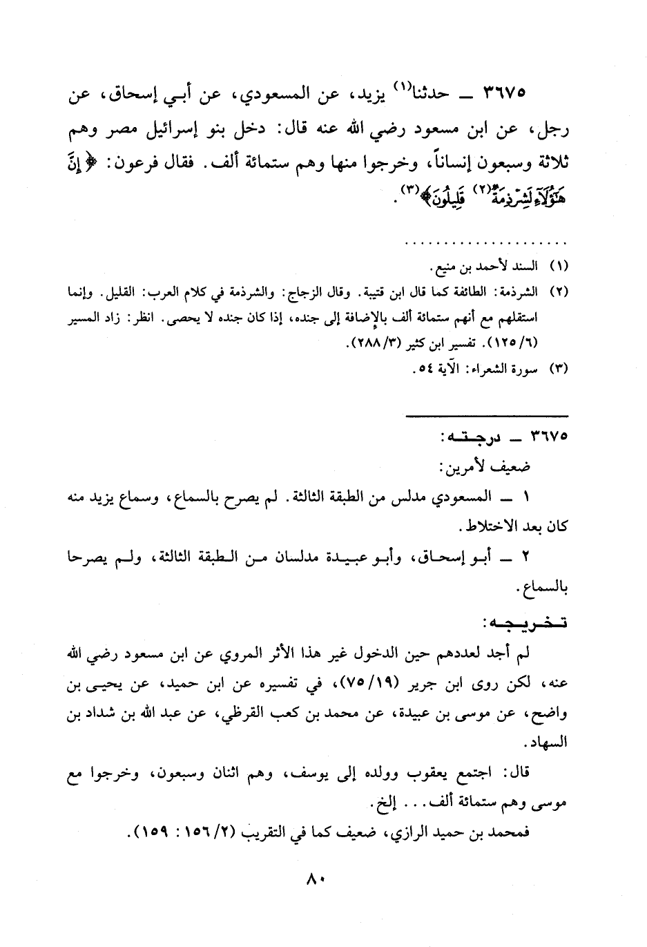 3675 - حَدَّثَنَا يَزِيدُ، عَنِ الْمَسْعُودِيِّ، عَنْ أَبِي إِسْحَاقَ، عَنْ رَجُلٍ، عَنِ ابْنِ مَسْعُودٍ رَضِيَ الله عَنْه قَالَ: §دَخَلَ بَنُو إِسْرَائِيلَ مِصْرَ وَهُمْ ثَلَاثَةٌ وَسَبْعُونَ إِنْسَانًا، وَخَرَجُوا مِنْهَا وَهُمْ سِتُّمِائَةِ أَلْفٍ. فَقَالَ فِرْعَوْنُ: {إِنَّ هَؤُلَاءِ لَشِرْذِمَةٌ قَلِيلُونَ} .