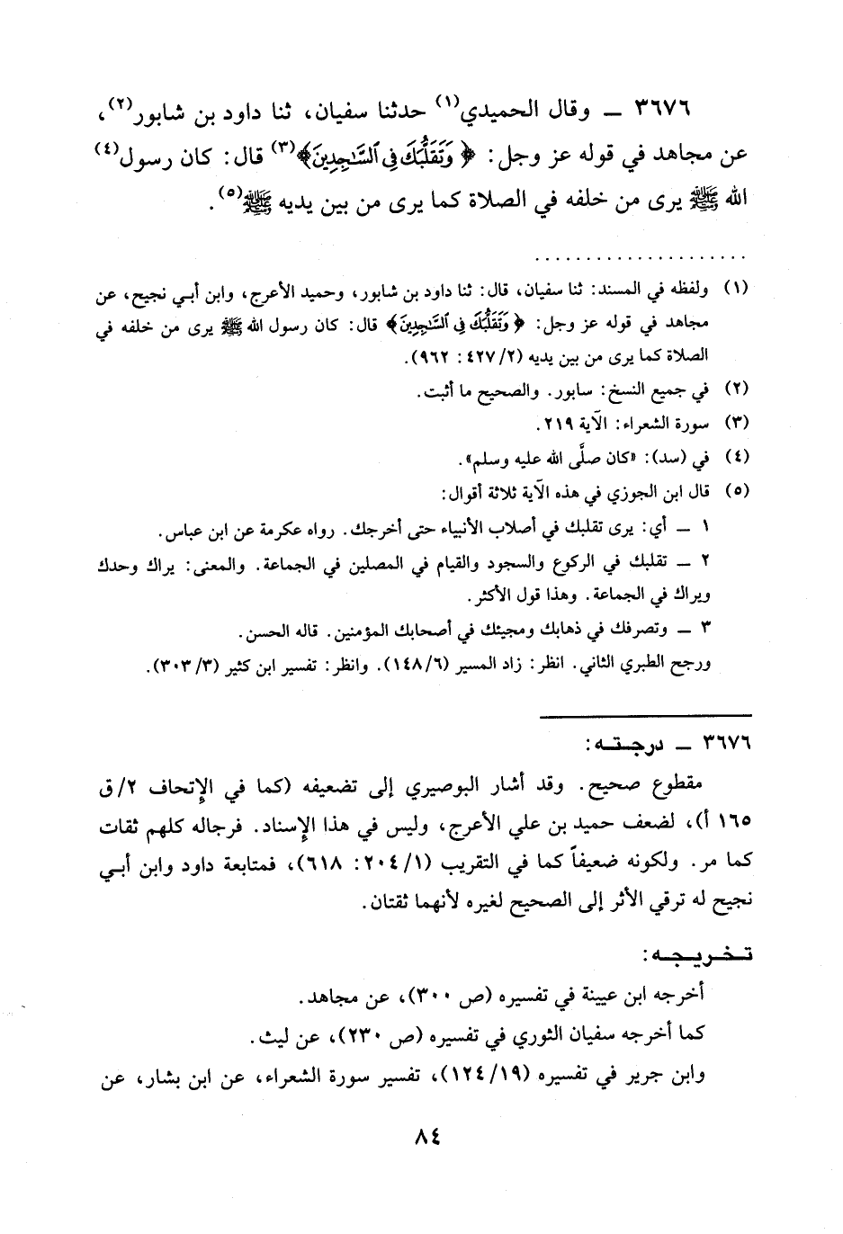 3676 - وَقَالَ الْحُمَيْدِيُّ حدثنا سُفْيَانُ، ثنا دَاوُدُ بْنُ شابور، عَنْ مُجَاهِدٍ فِي قَوْلِهِ عَزَّ وَجَلَّ: {وَتَقَلُّبَكَ فِي السَّاجِدِينَ} قَالَ: كَانَ رَسُولُ اللَّهِ صَلَّى اللَّهُ عَلَيْهِ وَسَلَّمَ §يَرَى مَنْ خَلْفِهِ فِي الصَّلَاةِ كَمَا يَرَى مَنْ بَيْنِ يَدَيْهِ صَلَّى اللَّهُ عَلَيْهِ وَسَلَّمَ.