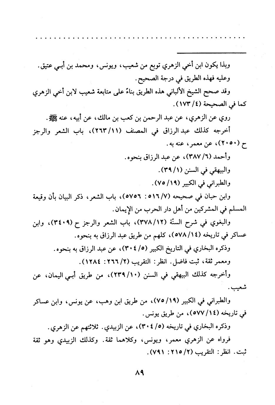 وقد صحح الشيخ الألباني هذه الطريق بناءً على متابعة شعيب لابن أخي الزهري كما في الصحيحة (4/ 173).