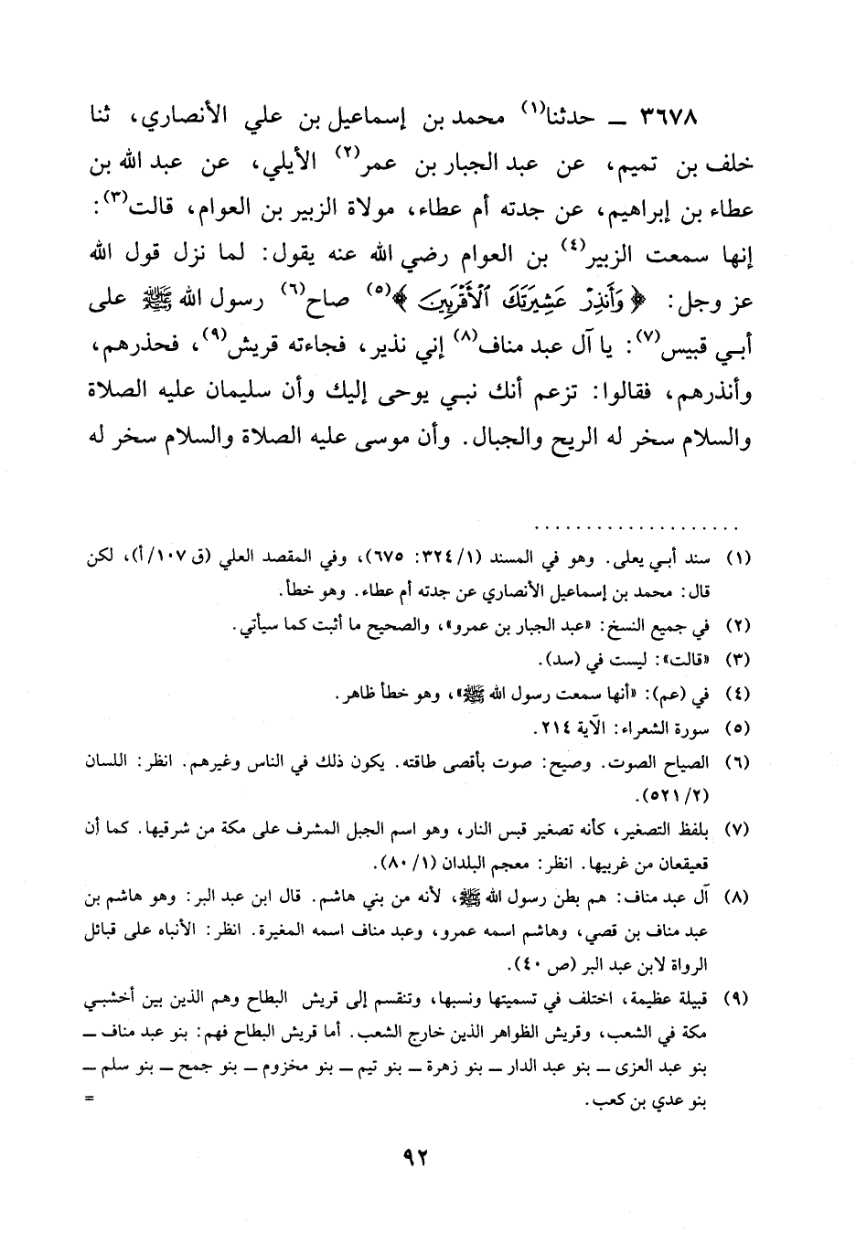 3678 - حدثنا مُحَمَّدُ بْنُ إِسْمَاعِيلَ بْنِ عَلِيٍّ الْأَنْصَارِيُّ، ثنا خَلَفُ بْنُ تَمِيمٍ، عَنْ عَبْدِ الْجَبَّارِ بْنِ عمر الْأَيْلِيِّ، عَنْ عَبْدِ اللَّهِ بْنِ عَطَاءِ بْنِ إِبْرَاهِيمَ، عَنْ جَدَّتِهِ أُمِّ عَطَاءٍ، مَوْلَاةِ الزُّبَيْرِ بْنِ الْعَوَّامِ، قالت: إِنَّهَا سَمِعْتُ الزُّبَيْرَ بْنَ الْعَوَّامِ رَضِيَ الله عَنْه يَقُولُ: لَمَّا نَزَلَ قَوْلُ اللَّهِ عَزَّ وَجَلَّ: {وَأَنْذِرْ عَشِيرَتَكَ الْأَقْرَبِينَ} صَاحَ رَسُولُ اللَّهِ صَلَّى اللَّهُ عَلَيْهِ وَسَلَّمَ عَلَى أَبِي قُبَيْسٍ: §يَا آلَ عَبْدِ مَنَافٍ إِنِّي نَذِيرٌ، فَجَاءَتْهُ قُرَيْشٌ، فَحَذَّرَهُمْ، وَأَنْذَرَهُمْ، فَقَالُوا: تزعم أَنَّكَ نَبِيٌّ يُوحَى إِلَيْكَ وَإِنَّ سُلَيْمَانَ عليه الصلاة والسلام سُخِّرَ لَهُ الرِّيحُ وَالْجِبَالُ. وأن موسى عليه الصلاة والسلام سُخِّرَ لَهُ