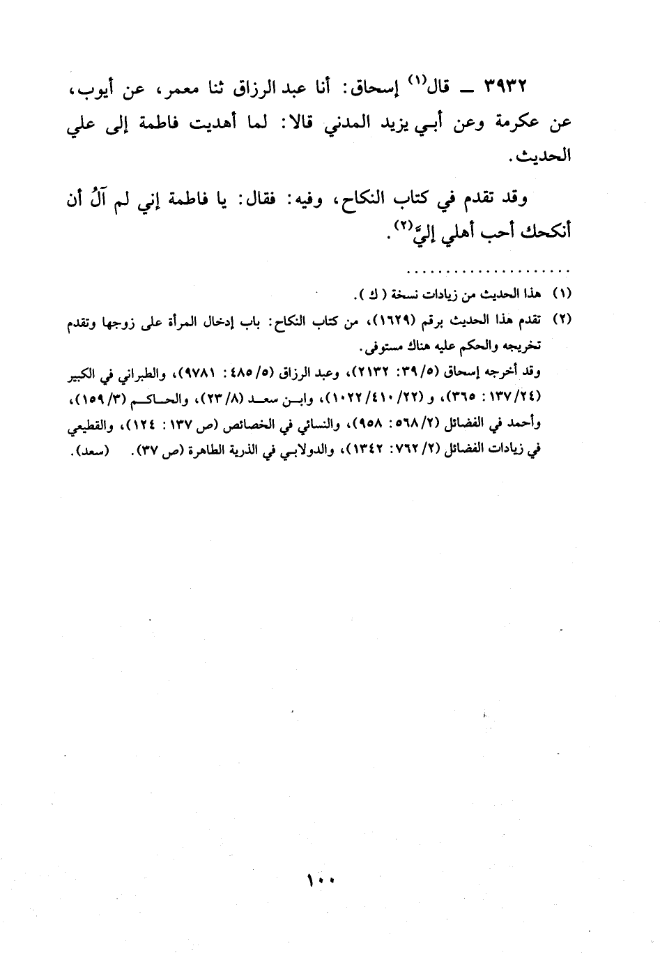 3932 - قَالَ إِسْحَاقُ: أنا عَبْدُ الرَّزَّاقِ ثنا مَعْمَرٌ، عَنْ أَيُّوبَ، عَنْ عِكْرِمَةَ وَعَنْ أَبِي يَزِيدَ الْمَدَنِيِّ قَالَا: لَمَّا أُهْدِيَتْ فَاطِمَةُ إِلَى عَلِيٍّ الْحَدِيثَ.