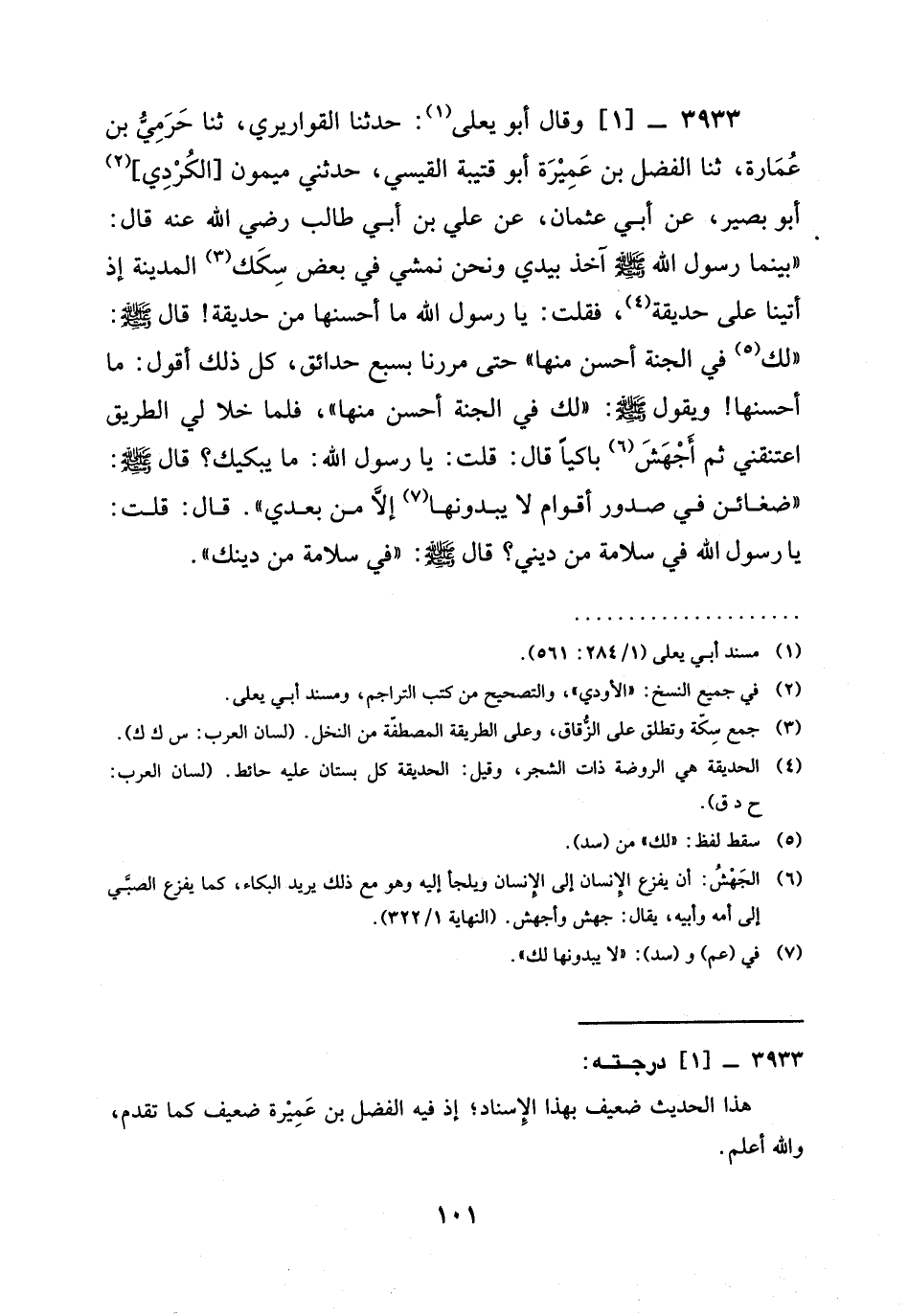 3933 -[1] وَقَالَ أَبُو يَعْلَى: حدثنا الْقَوَارِيرِيُّ، ثنا حَرَمِيُّ بْنُ عُمَارَةَ، ثنا الْفَضْلُ بْنُ عَمِيرَةَ أَبُو قُتَيْبَةَ الْقَيْسِيُّ، حَدَّثَنِي مَيْمُونٌ [الْكُرْدِيُّ] أَبُو بَصِيرٍ، عَنْ أَبِي عُثْمَانَ، عَنْ عَلِيِّ بْنِ أَبِي طَالِبٍ رَضِيَ الله عَنْه قَالَ: " §بَيْنَمَا رَسُولُ اللَّهِ صَلَّى اللَّهُ عَلَيْهِ وَسَلَّمَ آخِذٌ بِيَدِي وَنَحْنُ نَمْشِي فِي بَعْضِ سِكَكِ الْمَدِينَةِ إِذْ أَتَيْنَا عَلَى حَدِيقَةٍ، فَقُلْتُ: يَا رَسُولَ اللَّهِ مَا أَحْسَنُهَا مِنْ حَدِيقَةٍ! قَالَ صَلَّى اللَّهُ عَلَيْهِ وَسَلَّمَ: " لَكَ فِي الْجَنَّةِ أَحْسَنُ مِنْهَا " حَتَّى مَرَرْنَا بِسَبْعِ حَدَائِقَ، كُلُّ ذَلِكَ أَقُولُ: مَا أَحْسَنُهَا! وَيَقُولُ صَلَّى اللَّهُ عَلَيْهِ وَسَلَّمَ: " لَكَ فِي الْجَنَّةُ أَحْسَنُ مِنْهَا "، فَلَمَّا خَلَا لِي الطَّرِيقُ اعْتَنَقَنِي ثُمَّ أَجْهَشَ بَاكِيًا قَالَ: قُلْتُ: يَا رَسُولَ اللَّهِ: مَا يُبْكِيكَ؟ قَالَ صَلَّى اللَّهُ عَلَيْهِ وَسَلَّمَ: " ضَغَائِنُ فِي صُدُورِ أَقْوَامٍ لَا يُبْدُونَهَا إِلَّا مِنْ بَعْدِي ". قَالَ: قُلْتُ: يَا رَسُولَ اللَّهِ فِي سَلَامَةٍ مِنْ دِينِي؟ قَالَ صَلَّى اللَّهُ عَلَيْهِ وَسَلَّمَ: " فِي سَلَامَةٍ مِنْ دِينِكَ -[103]- ".