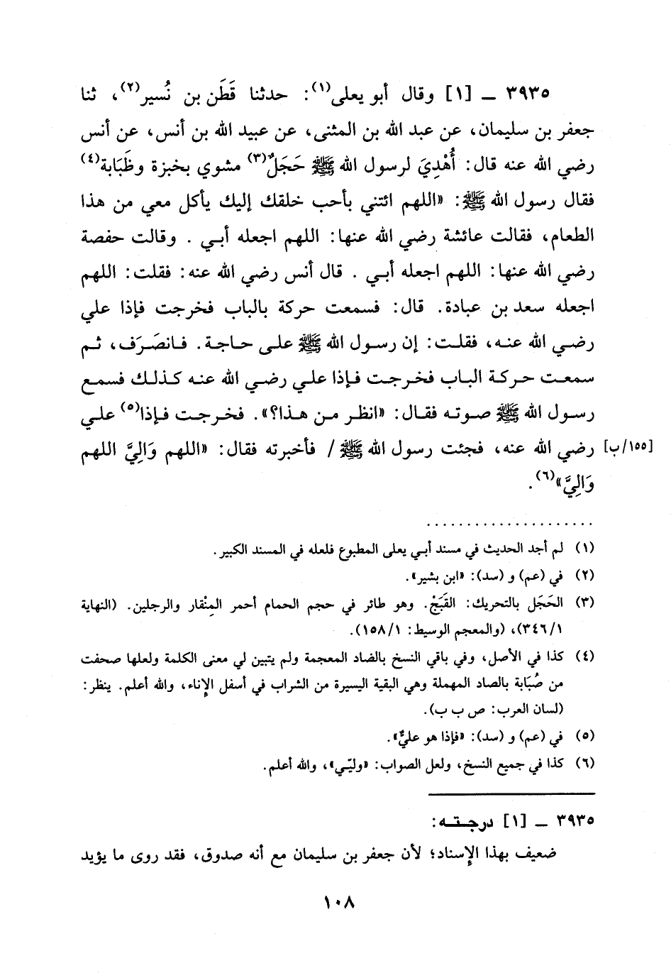 3935 -[1] وَقَالَ أَبُو يَعْلَى: حدثنا قَطَنُ بْنُ نَسِيرٍ، ثنا جَعْفَرُ بْنُ سُلَيْمَانَ، عَنْ عَبْدِ اللَّهِ بْنِ الْمُثَنَّى، عَنْ عُبَيْدِ اللَّهِ بْنِ أَنَسٍ، عَنْ أَنَسٍ رَضِيَ الله عَنْه قَالَ: أُهْدِيَ لِرَسُولِ اللَّهِ صَلَّى اللَّهُ عَلَيْهِ وَسَلَّمَ حَجَلٌ مَشْوِيٌّ بِخُبْزَةٍ وظبابة فَقَالَ رَسُولُ اللَّهِ صَلَّى اللَّهُ عَلَيْهِ وَسَلَّمَ: " §اللَّهُمَّ ائْتِنِي بِأَحَبِّ خَلْقِكَ إِلَيْكَ يَأْكُلُ مَعِي مِنْ هَذَا الطَّعَامِ، فقالت عائشة رَضِيَ الله عَنْها: اللَّهُمَّ اجْعَلْهُ أَبِي. وقالت حفصة رَضِيَ الله عَنْها: اللَّهُمَّ اجْعَلْهُ أَبِي. قَالَ أَنَسٌ رَضِيَ الله عَنْه: فَقُلْتُ: اللَّهُمَّ اجْعَلْهُ سَعْدَ بْنَ عُبَادَةَ. قَالَ: فَسَمِعْتُ حَرَكَةً بِالْبَابِ فَخَرَجْتُ فَإِذَا عَلِيٌّ رَضِيَ الله عَنْه، فَقُلْتُ: إِنَّ رَسُولَ اللَّهِ صَلَّى اللَّهُ عَلَيْهِ وَسَلَّمَ عَلَى حَاجَةٍ. فَانْصَرَفَ، ثُمَّ سَمِعْتُ حَرَكَةً الباب فَخَرَجْتُ فَإِذَا عَلِيٌّ رَضِيَ الله عَنْه كَذَلِكَ فَسَمِعَ رَسُولَ اللَّهِ صَلَّى اللَّهُ عَلَيْهِ وَسَلَّمَ صَوْتَهُ فَقَالَ: " انْظُرْ مَنْ هَذَا؟ ". فَخَرَجْتُ فَإِذَا عَلِيٌّ رَضِيَ الله عَنْه، فَجِئْتُ رَسُولَ اللَّهِ صَلَّى اللَّهُ عَلَيْهِ وَسَلَّمَ / فَأَخْبَرْتُهُ فَقَالَ: " اللَّهُمَّ وَإِلَيَّ اللَّهُمَّ وَإِلَيَّ -[110]- ".