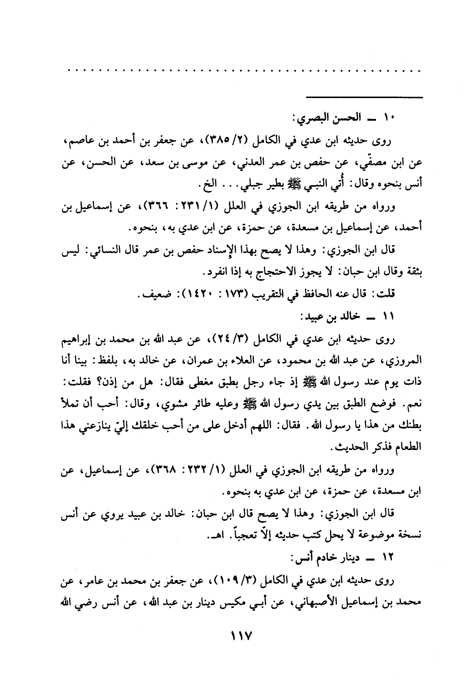 روى حديثه ابْنُ عَدِيٍّ فِي الْكَامِلِ (2/ 385)، عَنْ جَعْفَرِ بْنِ أحمد بن عاصم، عن ابن مصفّي، عن حفص بن عمر العدني، عن موسى بن سعد، عن الحسن، عن أنس بنحوه وقال: أُتي النبي -صلى الله عليه وسلم- بطير جبلي ... الخ.