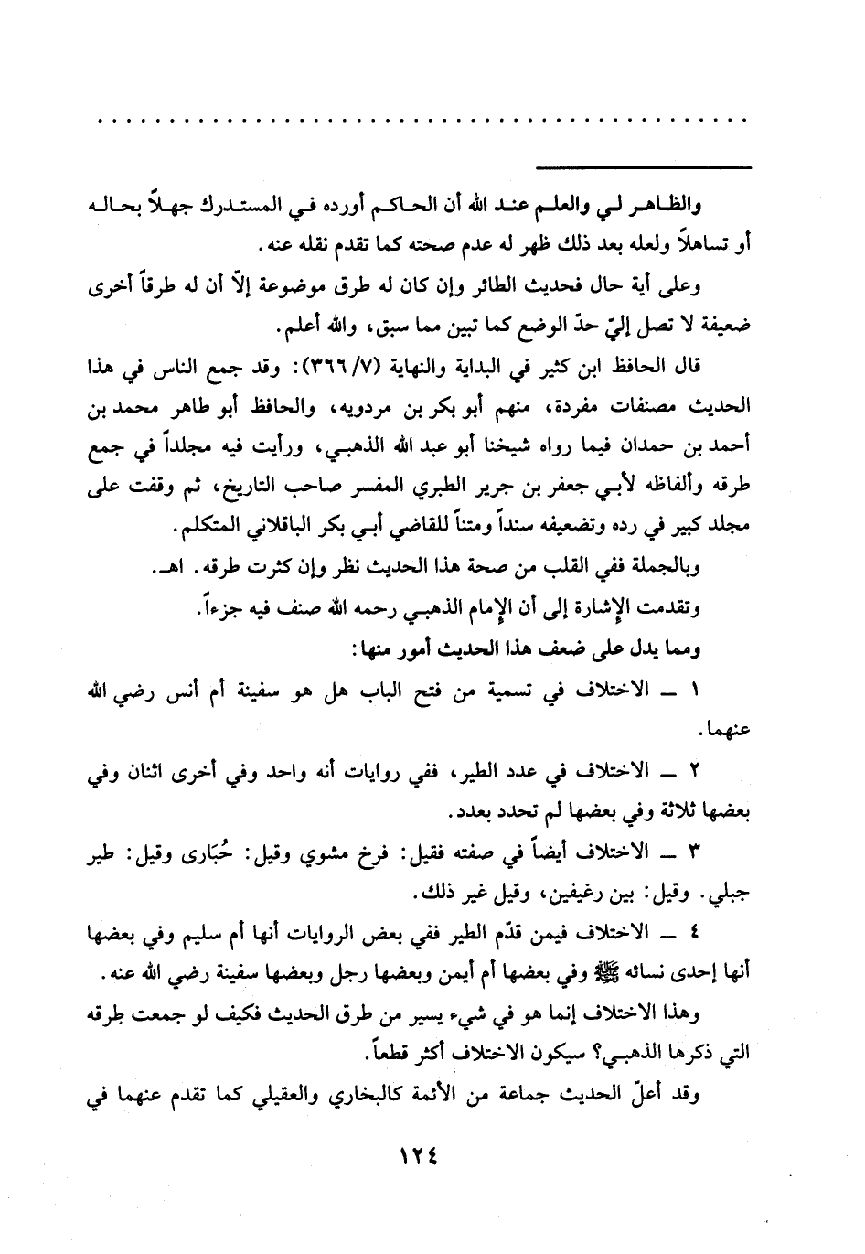 وعلى آية حال فحديث الطائر وإن كان له طرق موضوعة إلَّا أن له طرفًا أخرى ضعيفة لا تصل إلىّ حدّ الوضع كما تبين مما سبق، والله أعلم.