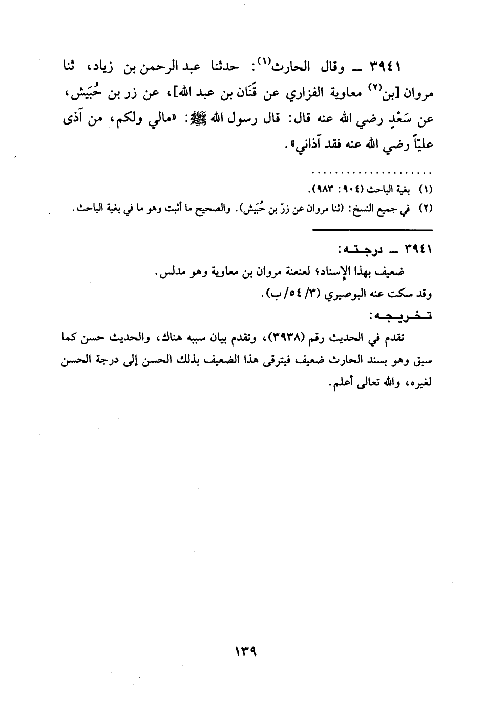 3941 - وَقَالَ الْحَارِثُ: حدثنا عَبْدُ الرَّحْمَنِ بْنُ زِيَادٍ، ثنا مروان [بن معاوية الفزاري عَنْ قَنَانِ بْنِ عَبْدِ اللَّهِ] ، عَنْ زِرِّ بْنِ حُبَيْشٍ، عَنْ سَعْدٍ رَضِيَ الله عَنْه قَالَ: قَالَ رسول الله صَلَّى اللَّهُ عَلَيْهِ وَسَلَّمَ: " مالي وَلَكُمْ، §مَنْ آذَى عَلِيًّا رَضِيَ الله عَنْه فَقَدْ أَذَانِي ".