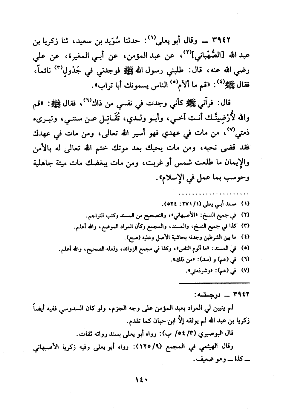 3942 - وَقَالَ أَبُو يَعْلَى: حدثنا سُوَيْدُ بْنُ سَعِيدٍ، ثنا زَكَرِيَّا بْنُ عَبْدِ اللَّهِ [الْصُّهْبَانِيُّ] ، عَنْ عَبْدِ الْمُؤْمِنِ، عَنْ أَبِي الْمُغِيرَةِ، عَنْ عَلِيٍّ رَضِيَ الله عَنْه، قَالَ: §طَلَبَنِي رَسُولُ اللَّهِ صَلَّى اللَّهُ عَلَيْهِ وَسَلَّمَ فَوَجَدَنِي فِي جَدْوَلٍ نَائِمًا، فَقَالَ صَلَّى اللَّهُ عَلَيْهِ وَسَلَّمَ: " قُمْ مَا ألأم النَّاسَ يُسَمُّونَكَ أَبَا تُرَابٍ ".